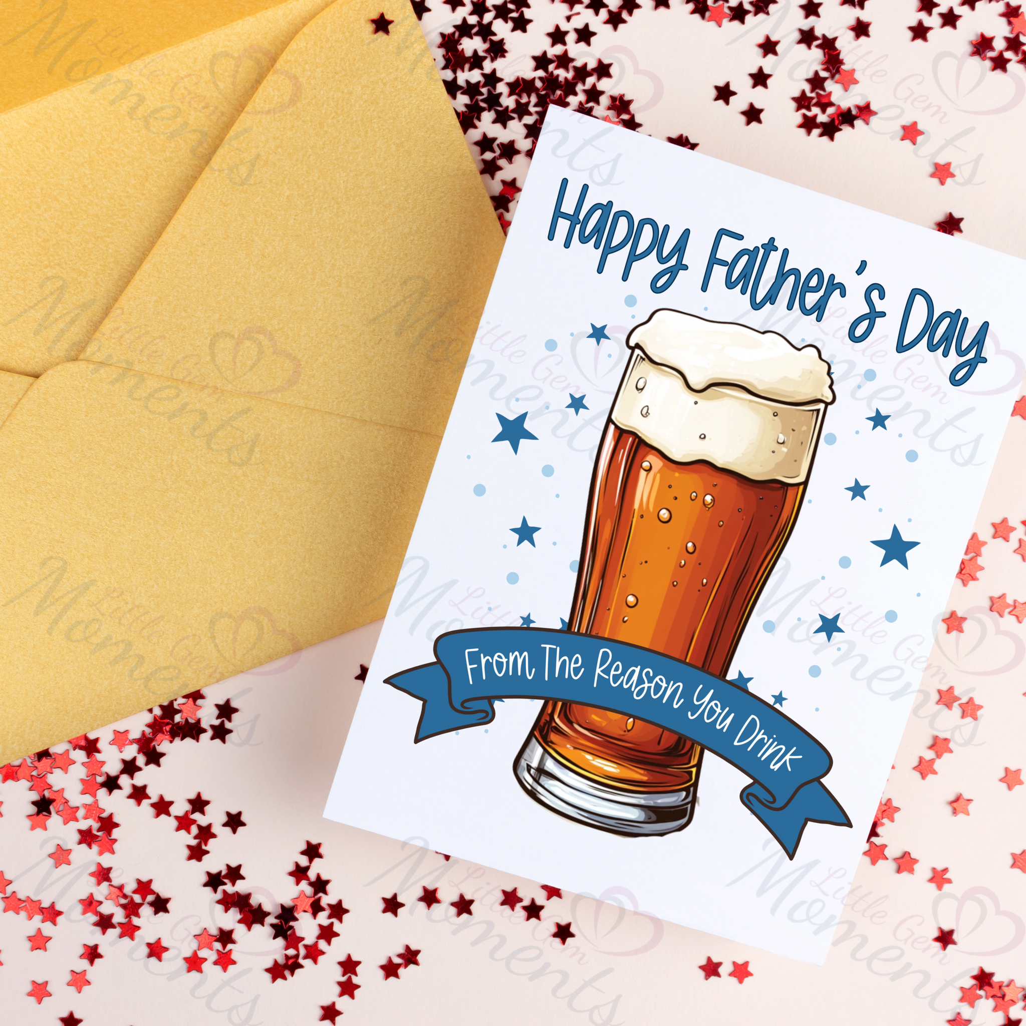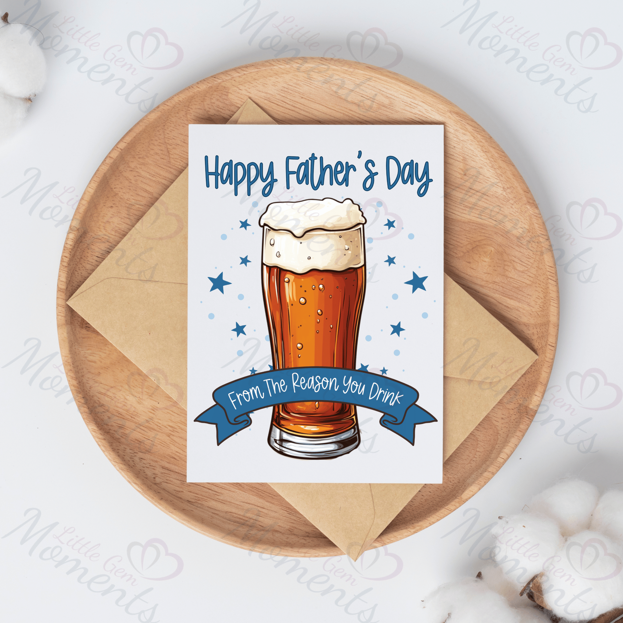 Features image of a pint of beer, with the words "Happy Father's Day" above and the words "from the reason you drink" in a blue scroll across the bottom