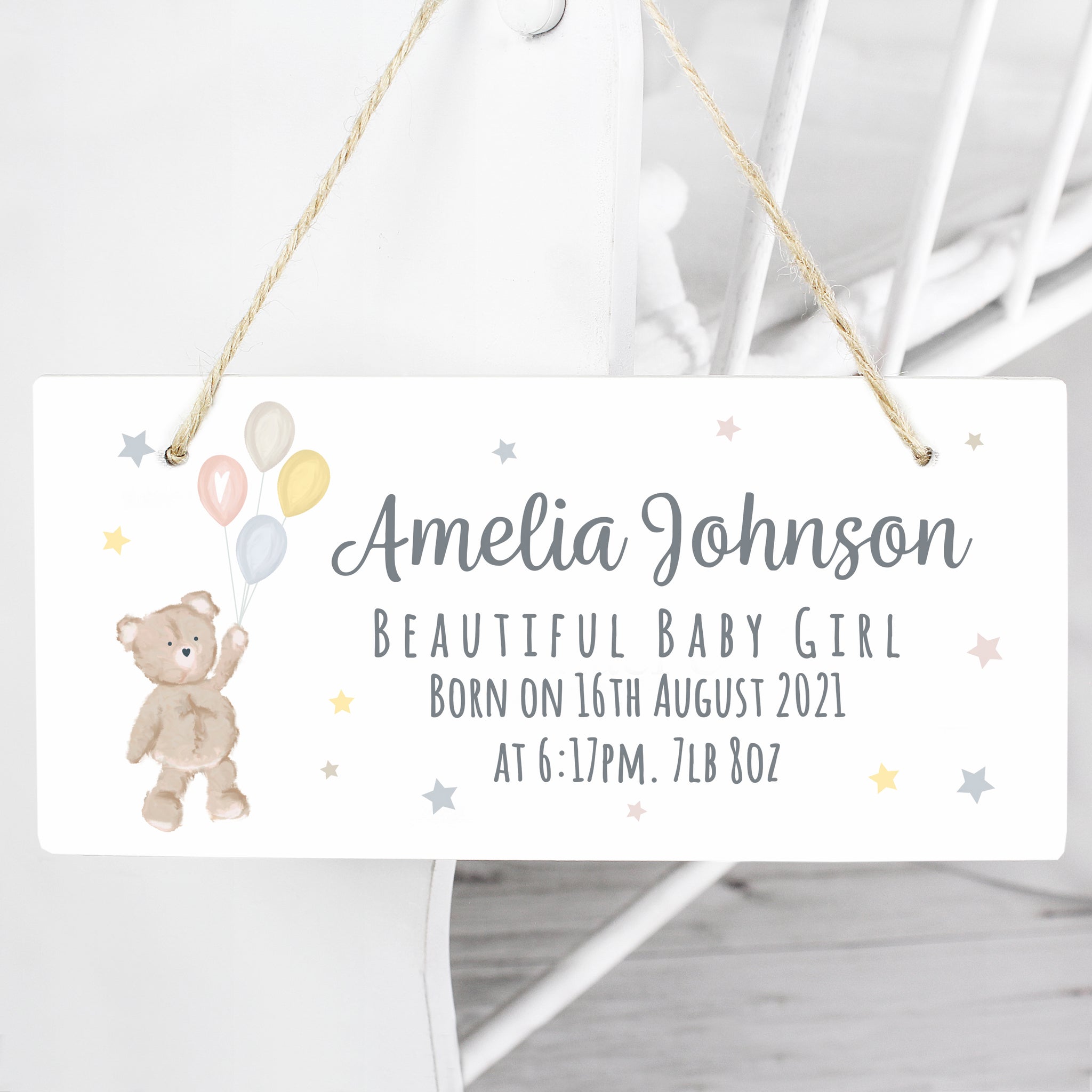 This fabulous personalised Teddy & Balloons Hanging Wooden Sign will look great on a bedroom door, or proudly displayed around the home.