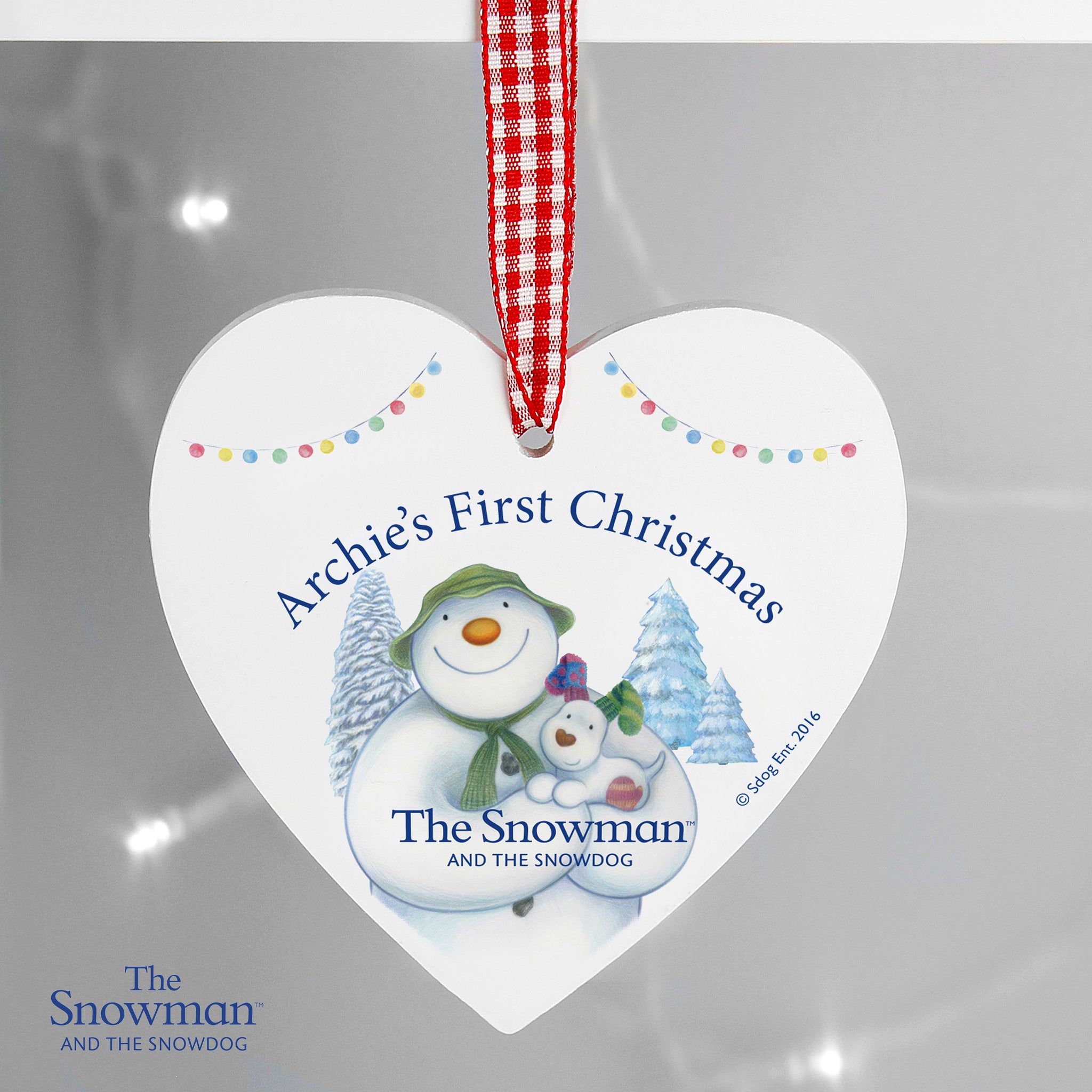 Personalised The Snowman and the Snowdog Wooden Heart Decoration