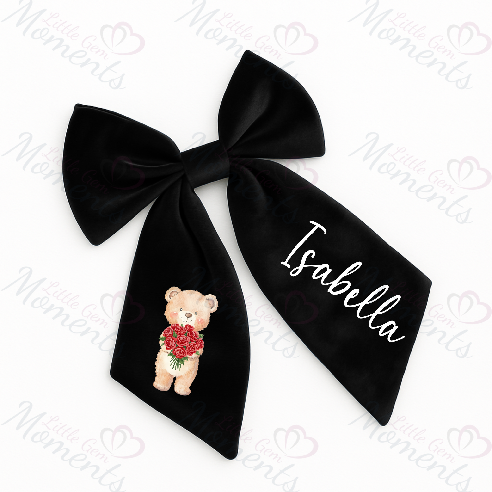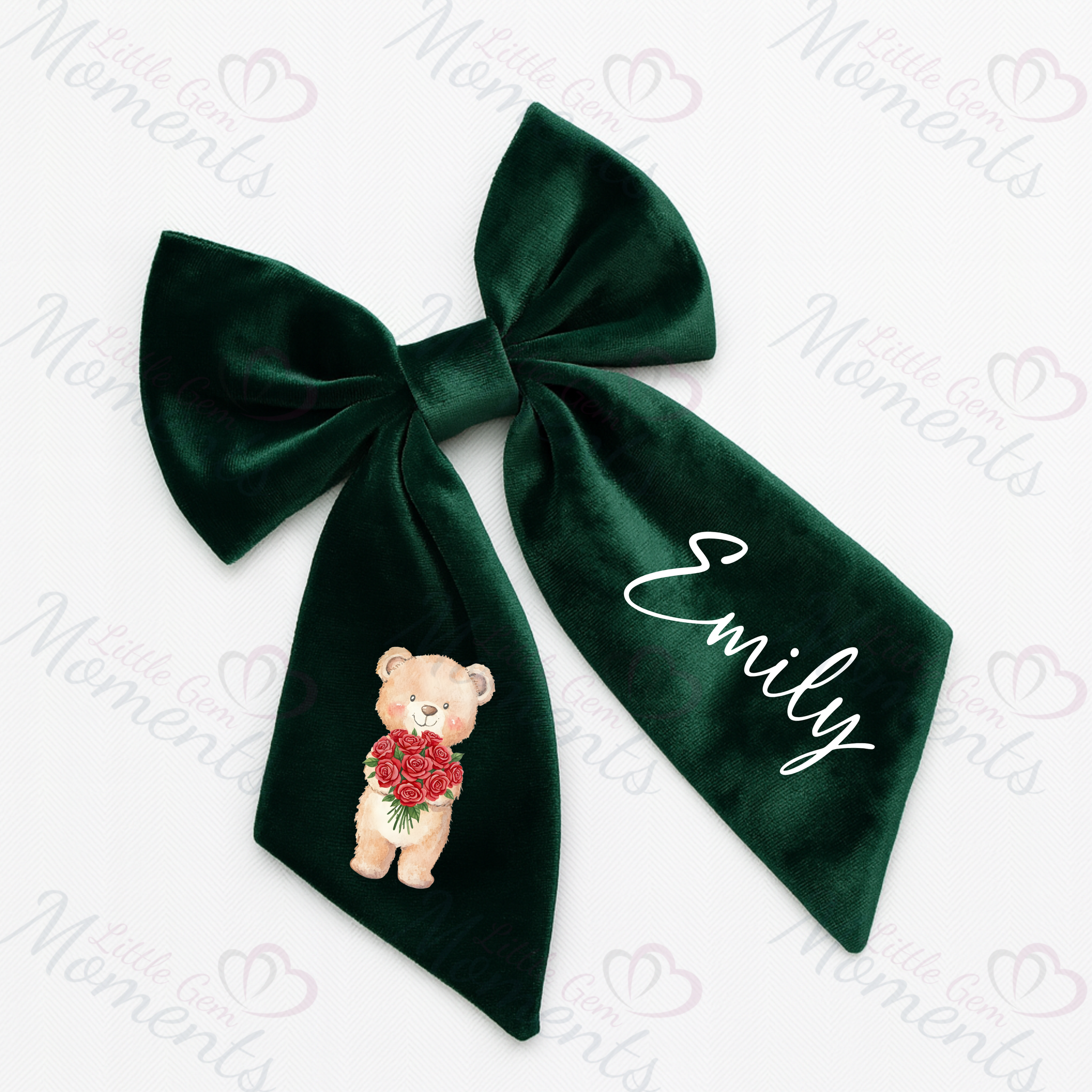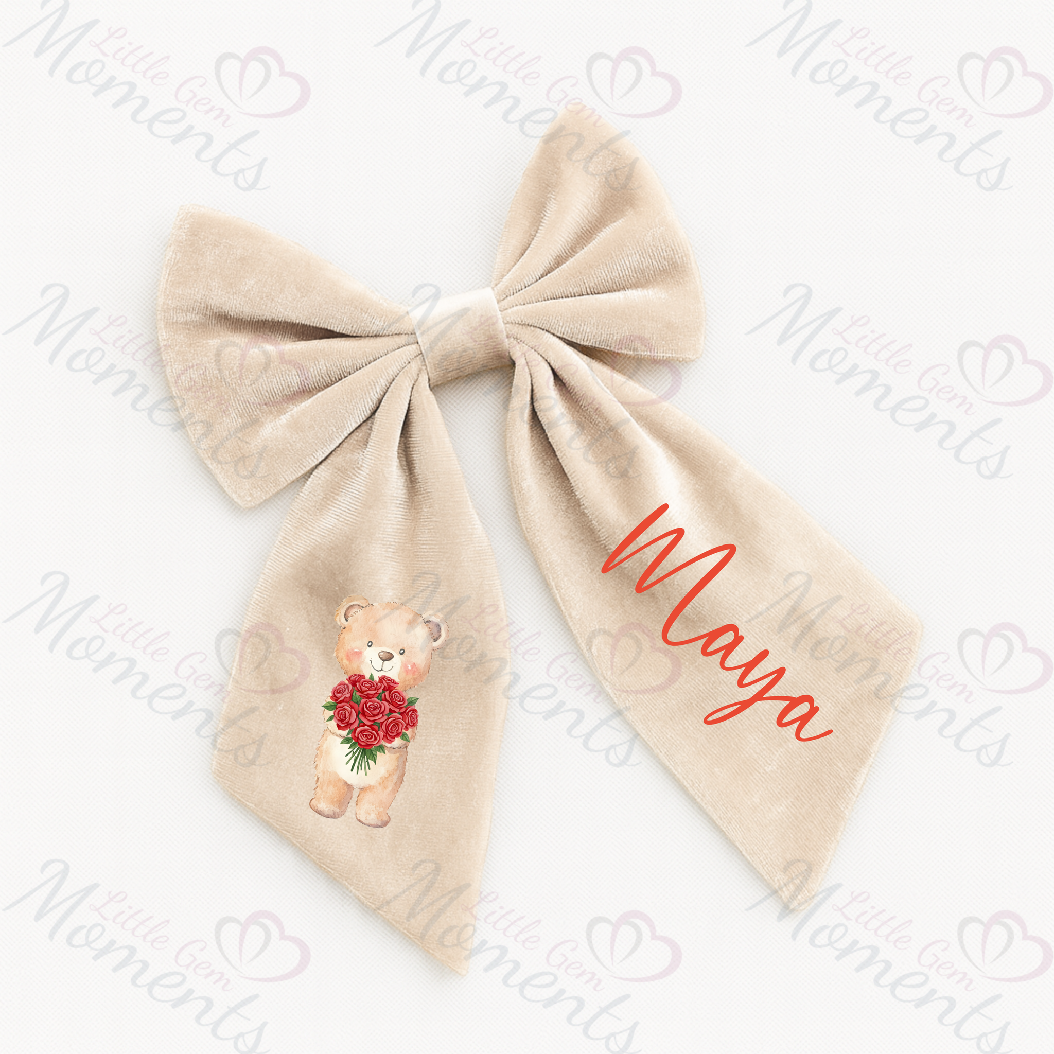 Personalised Valentine's Velvet Hair Bow - Teddy Flowers Design