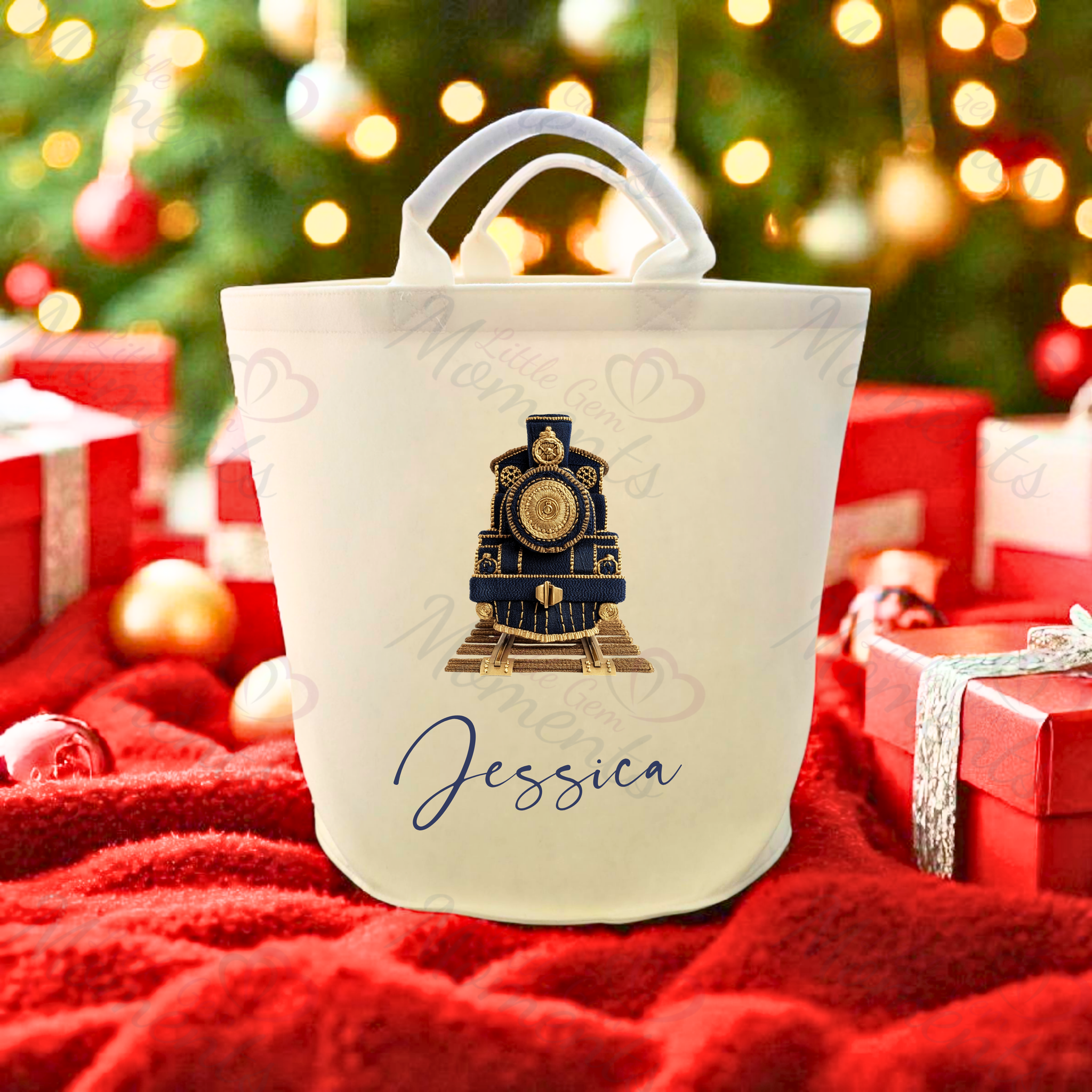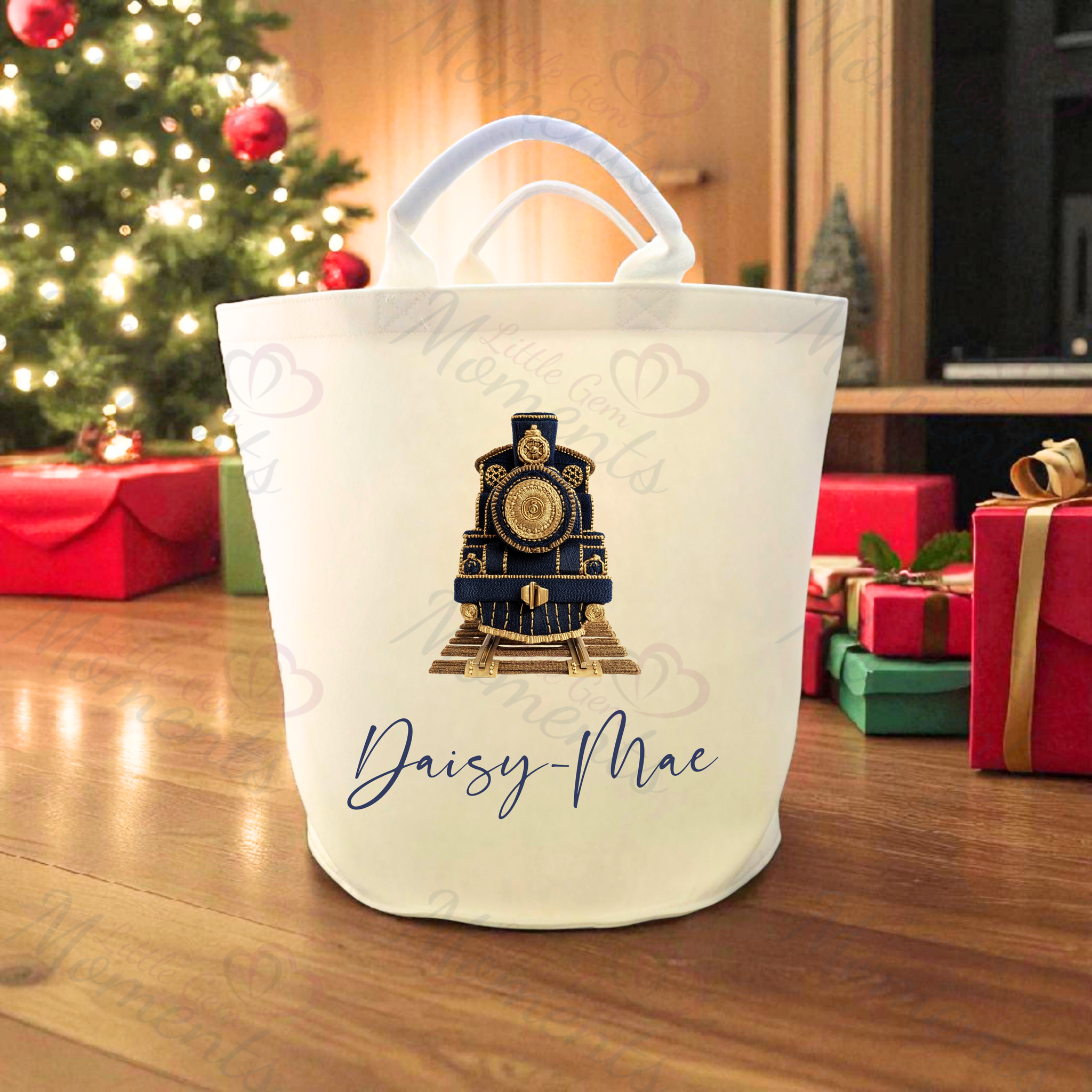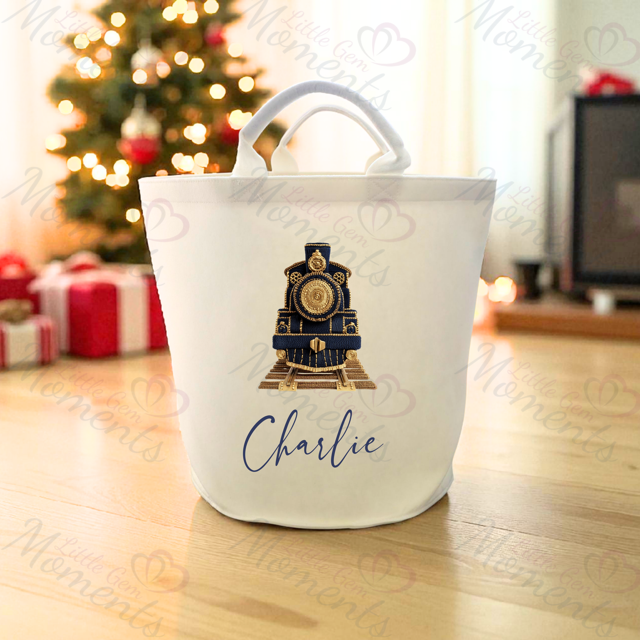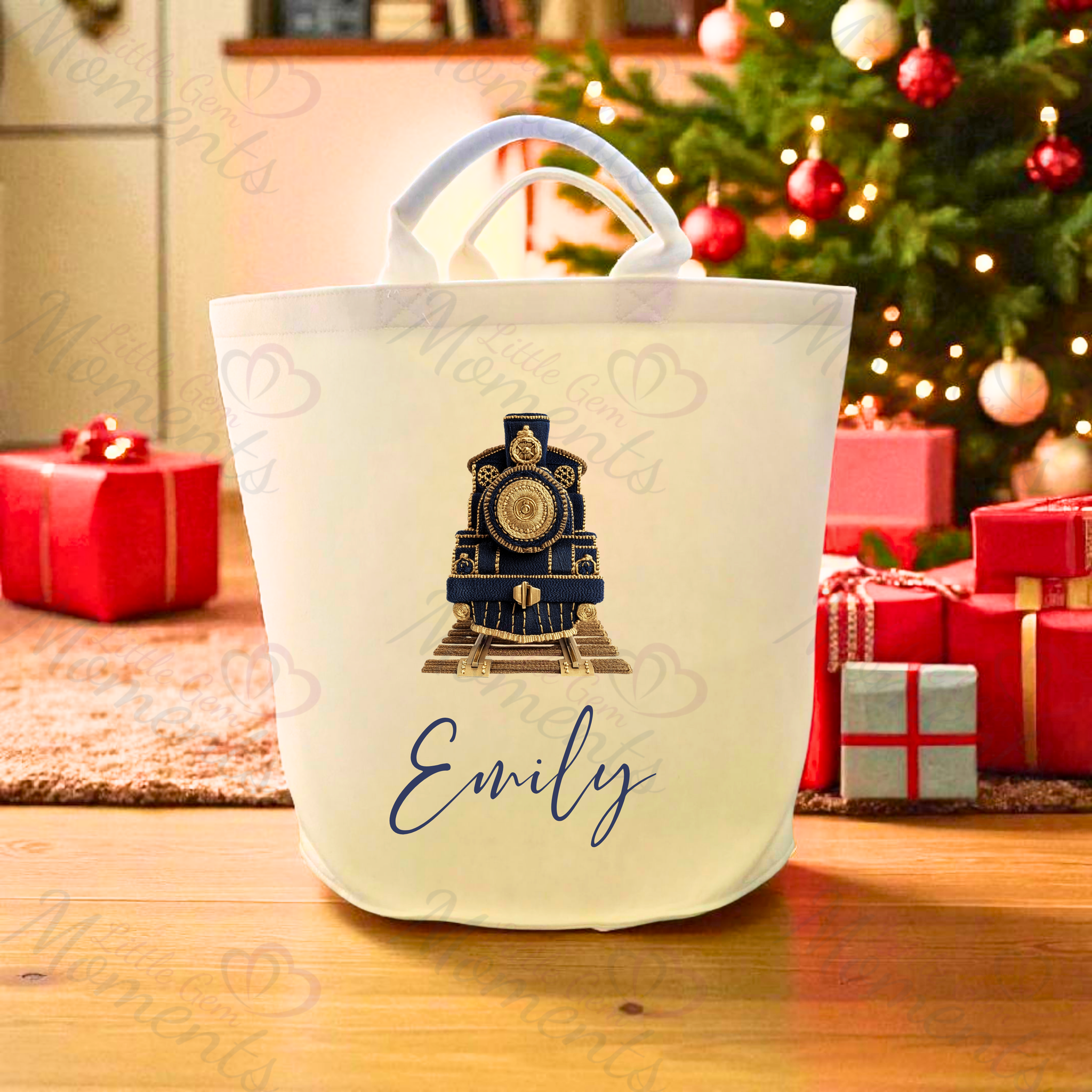 Personalised Christmas Gift Basket Trug. Festive Gift Sack - Christmas Navy Train Design