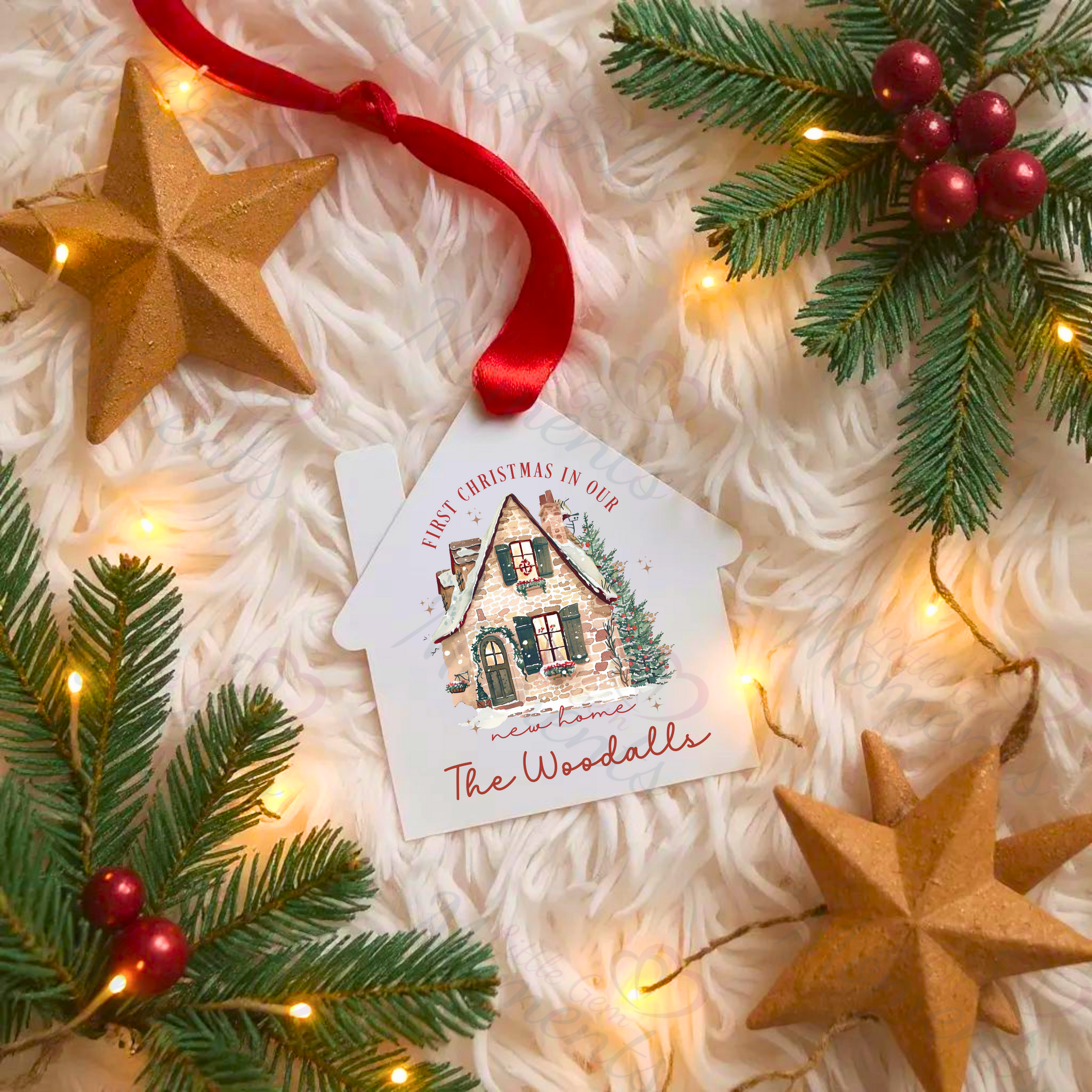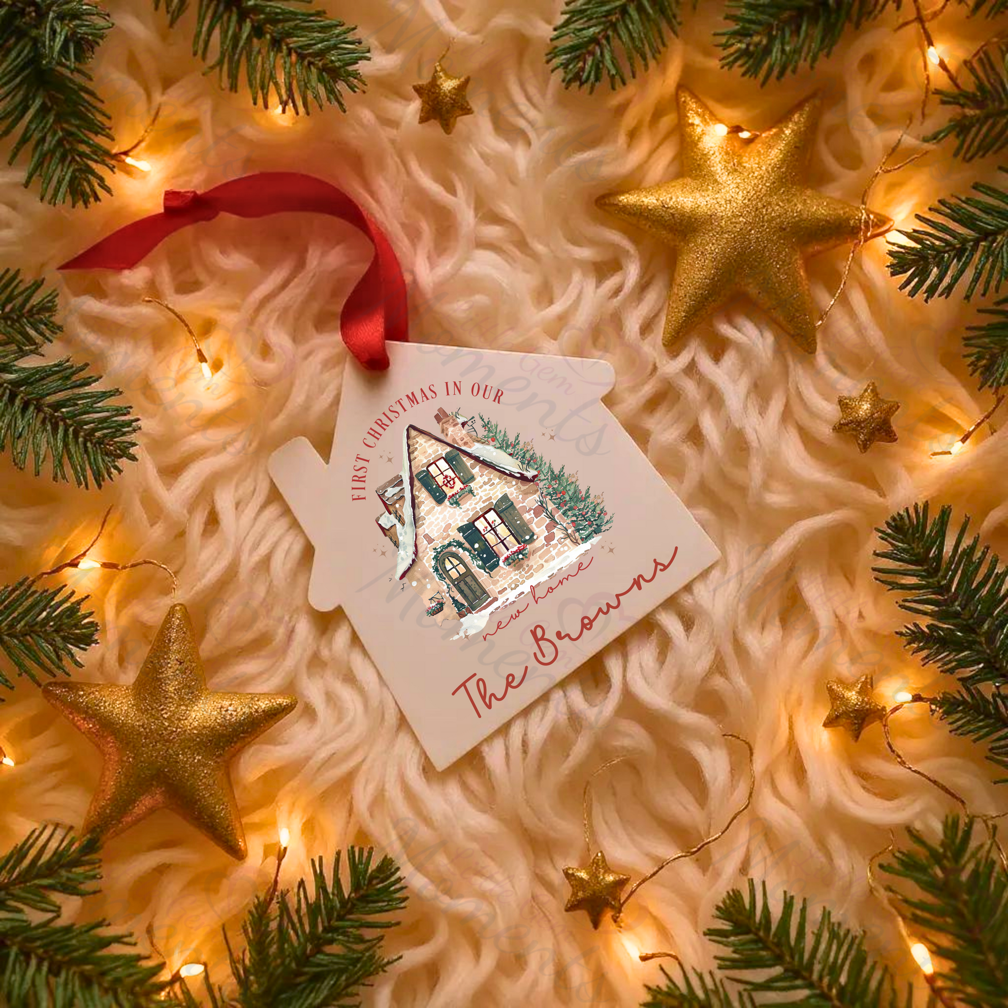 Personalised "First Christmas In Our New Home" Bauble. House Shaped Acrylic Xmas Tree Decoration