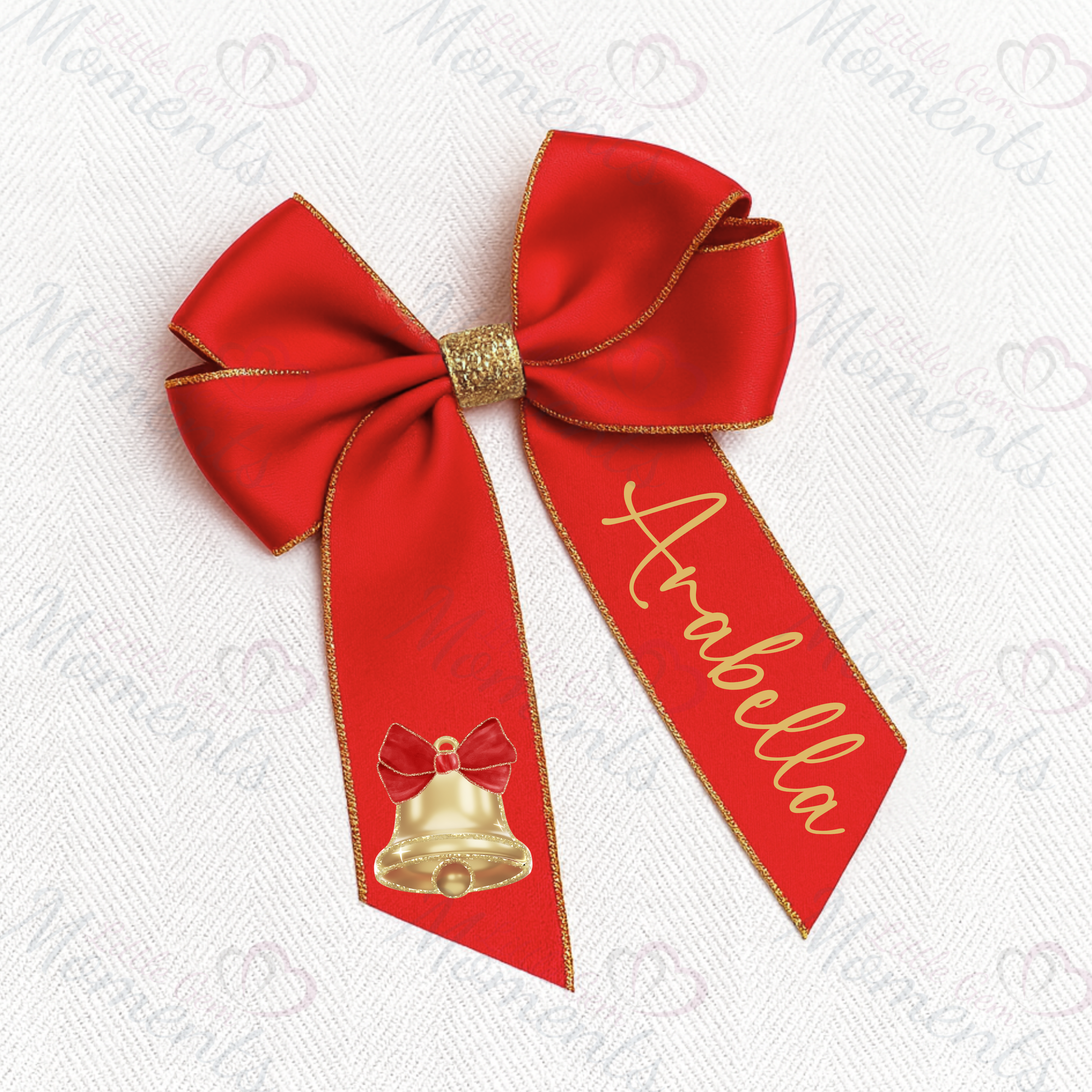 Personalised Glitter Trim Christmas Hair Bow - Festive Bell Design - Multiple Colours - 6 Inch Bow