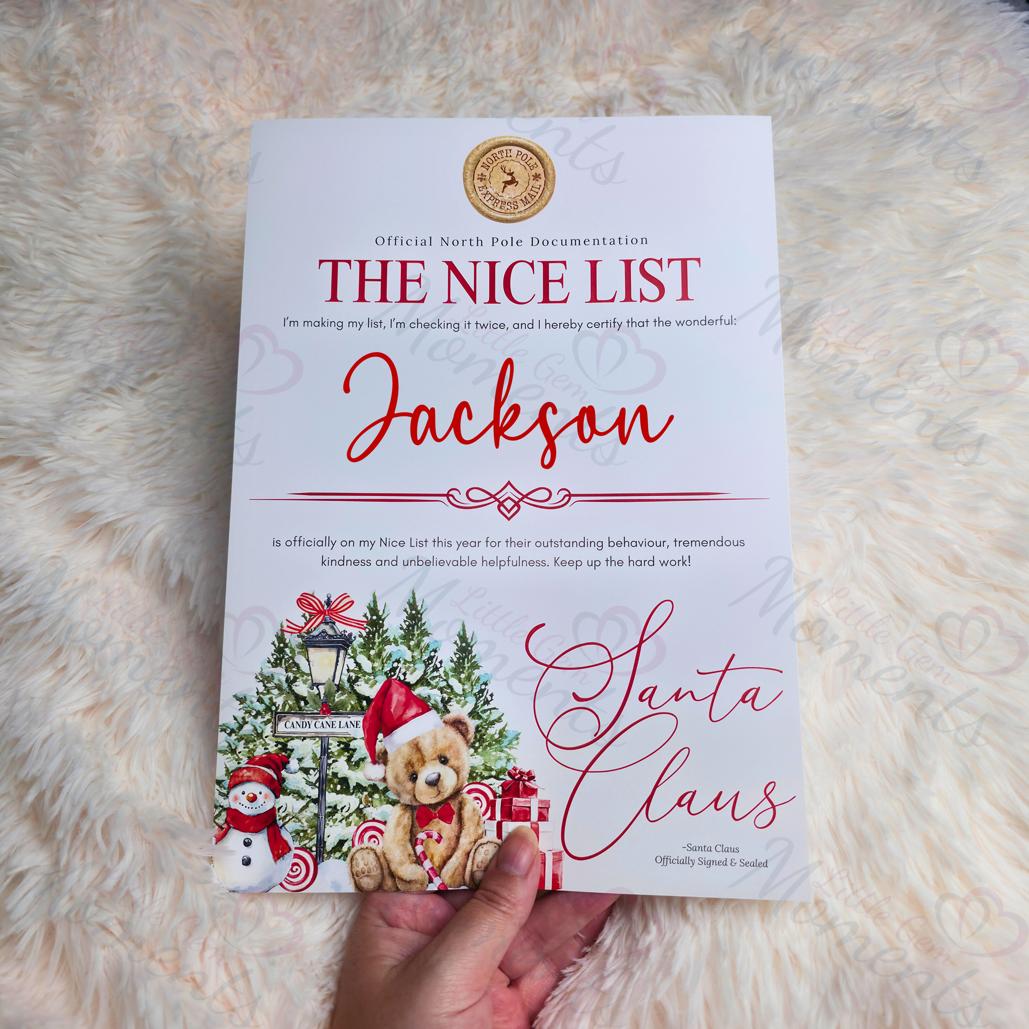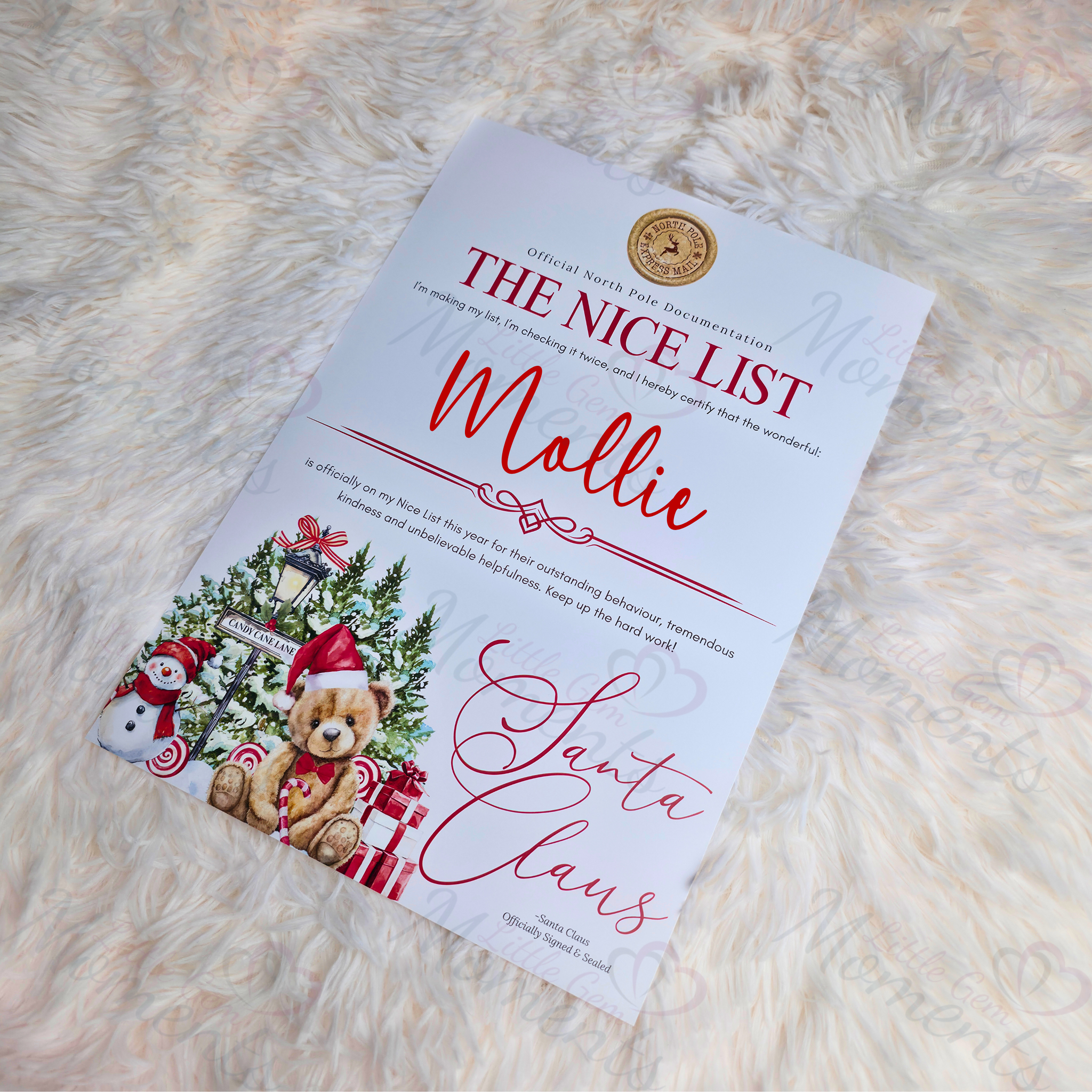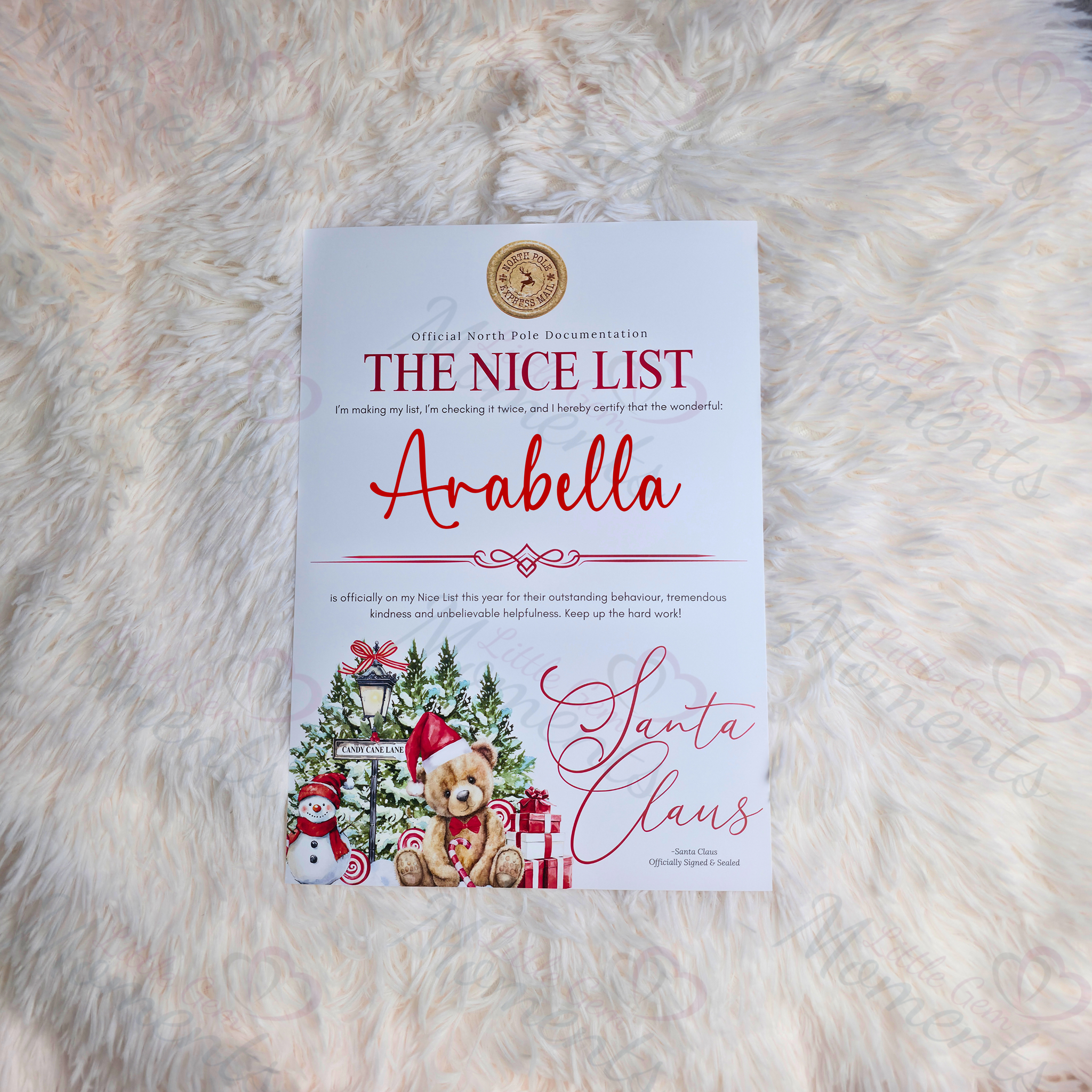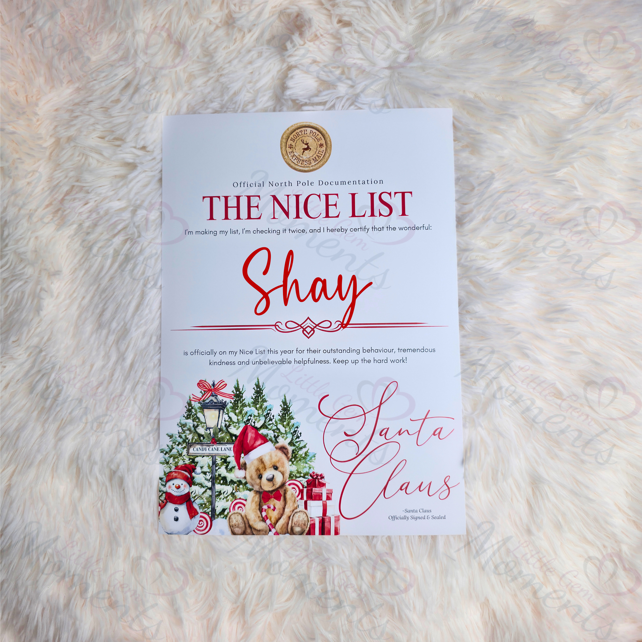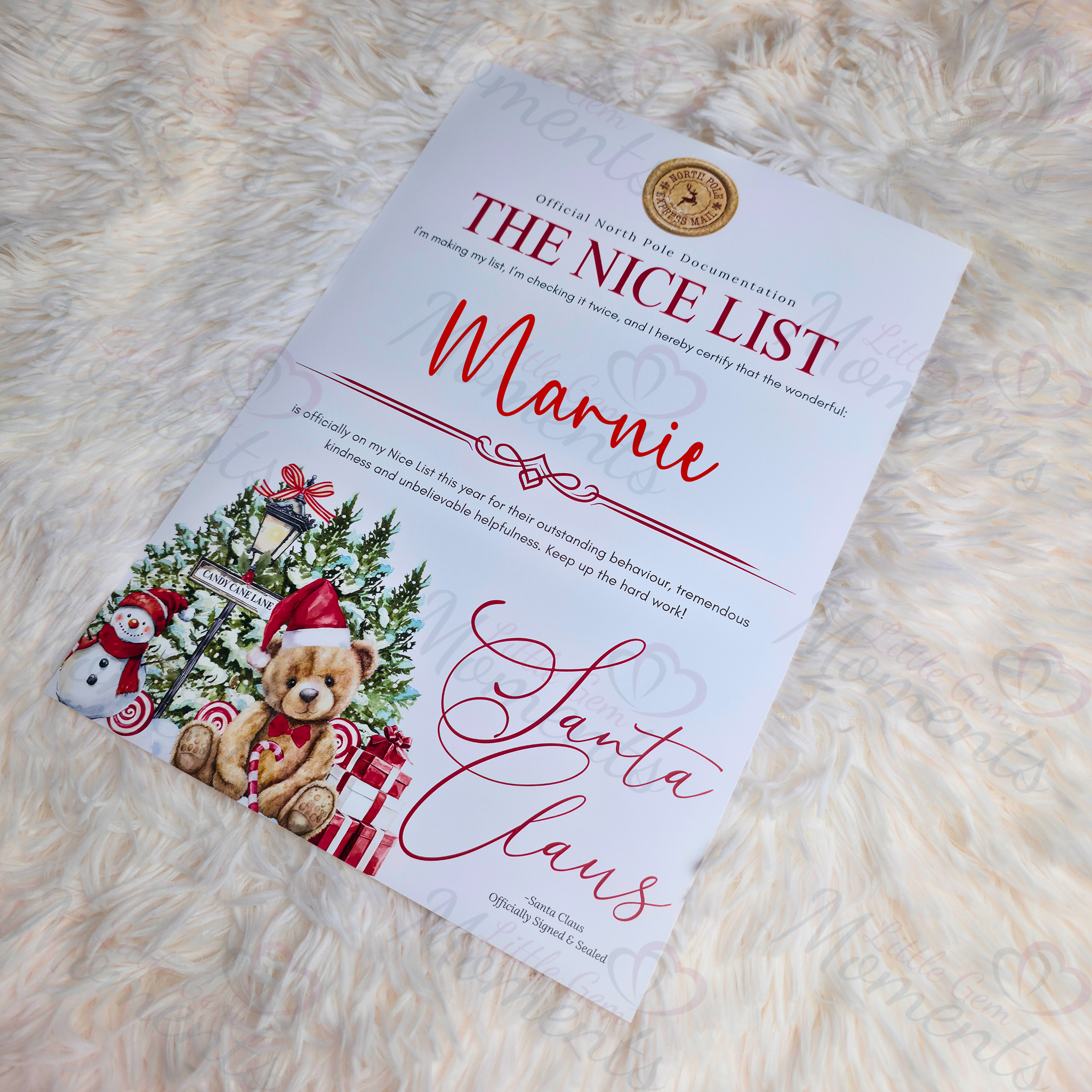 Personalised Nice List Certificate - Candy Cane Lane Red Design. Custom Kids Christmas Eve Box Filler.