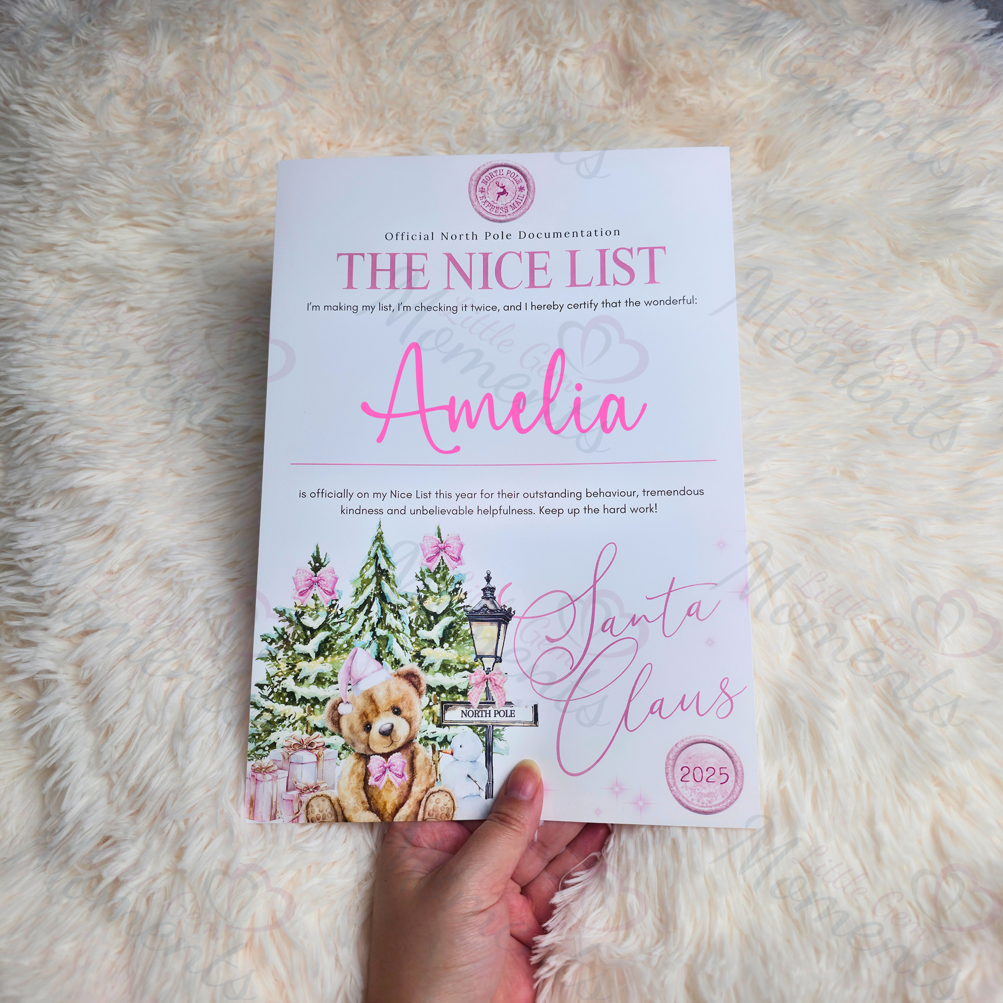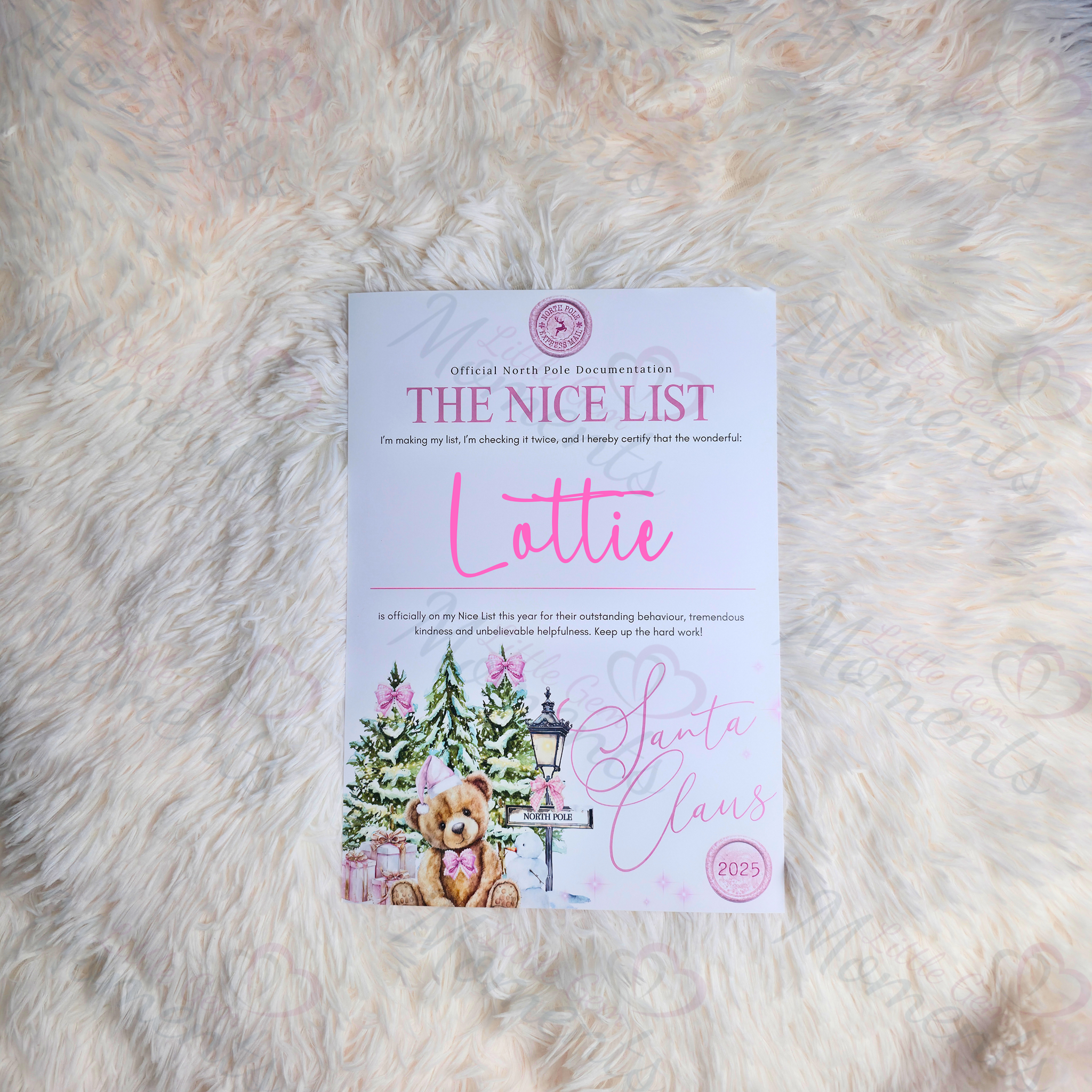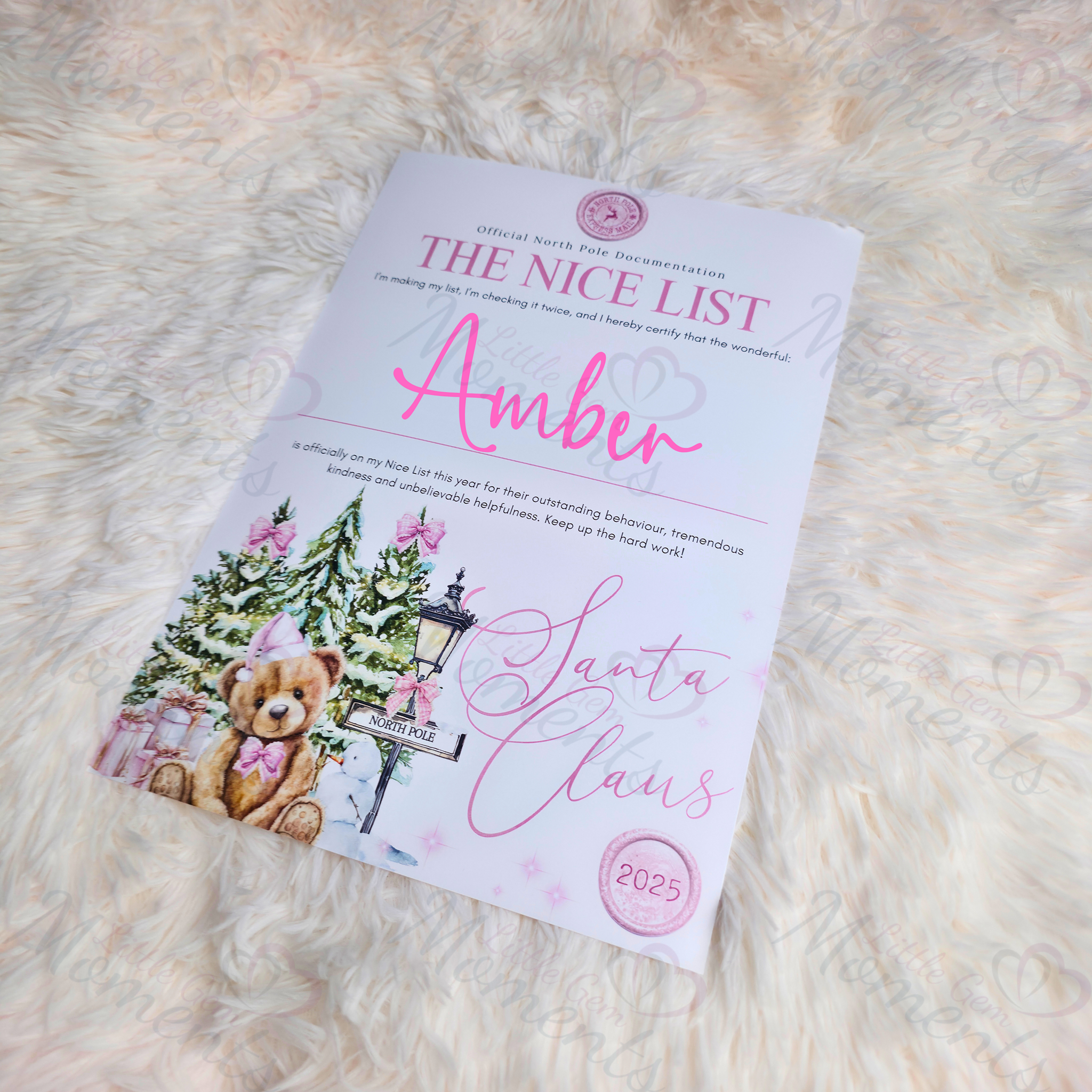 Personalised Nice List Certificate - Pink North Pole Design. Custom Christmas Eve Box Fillers