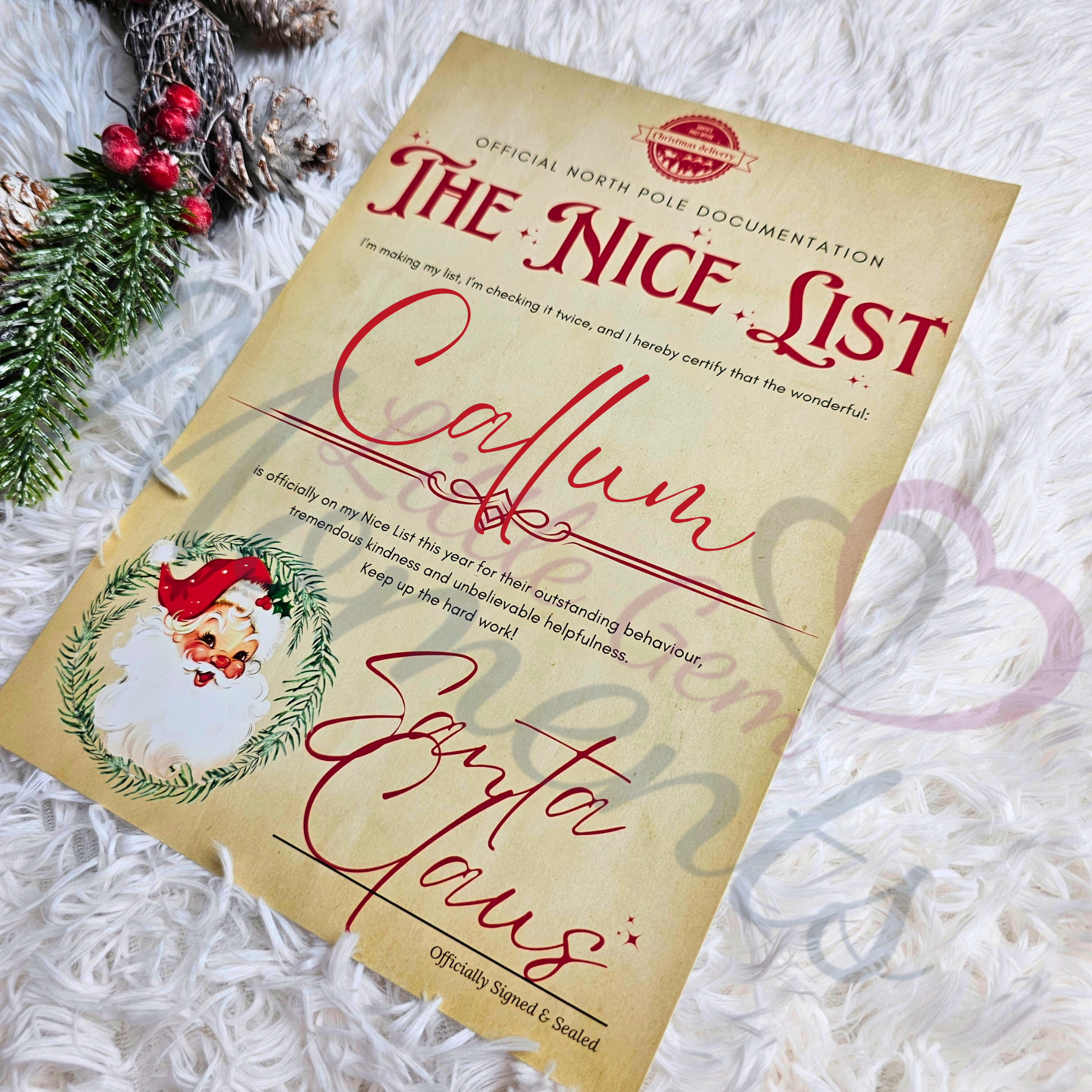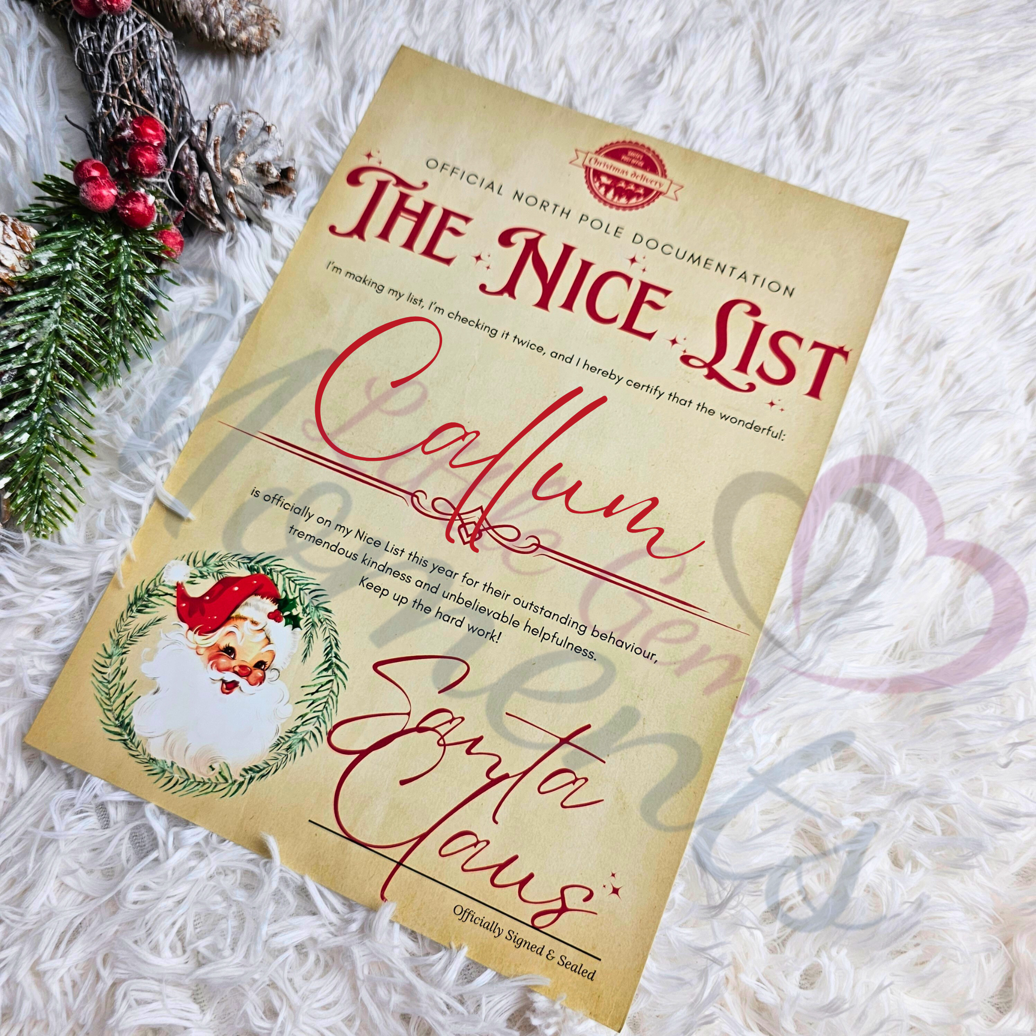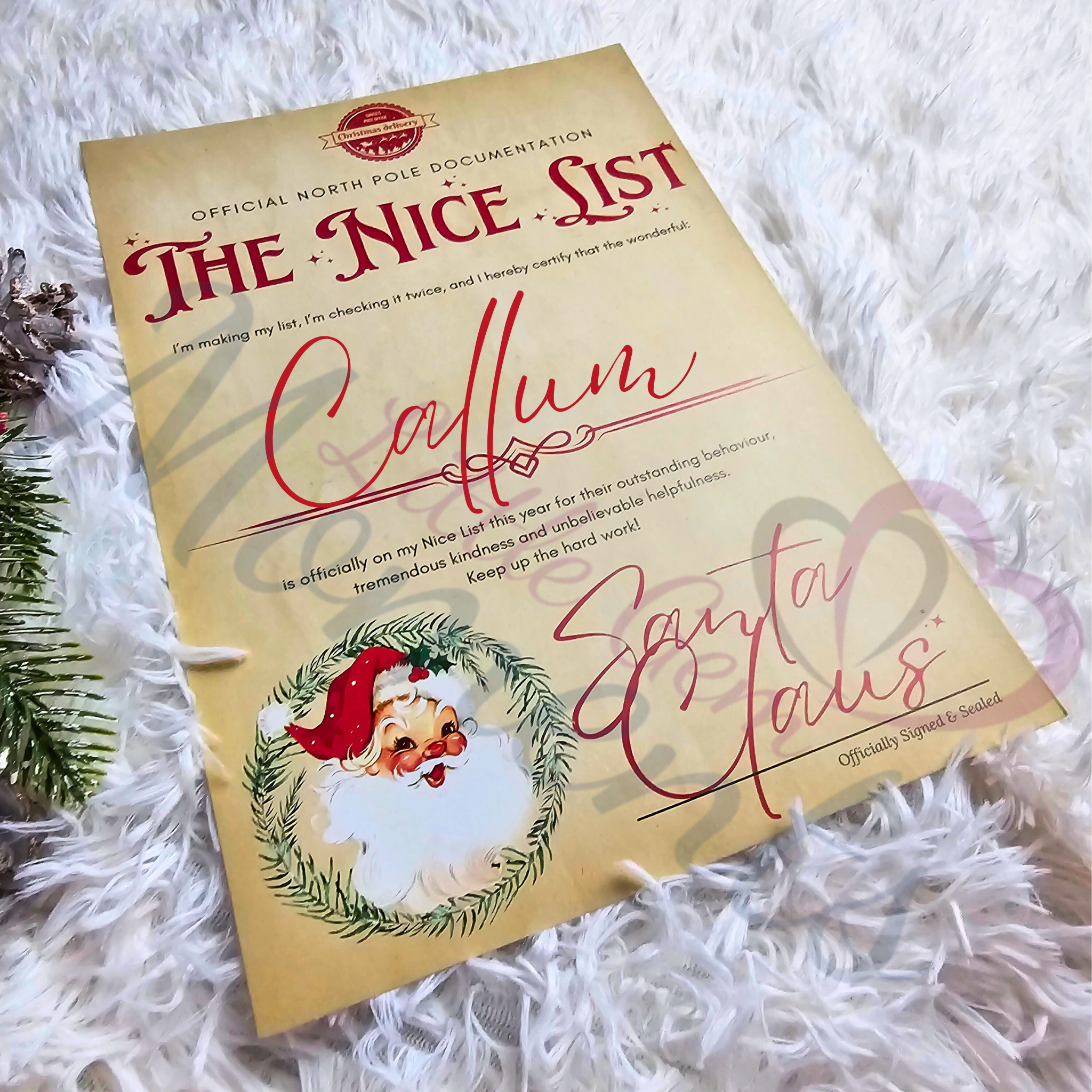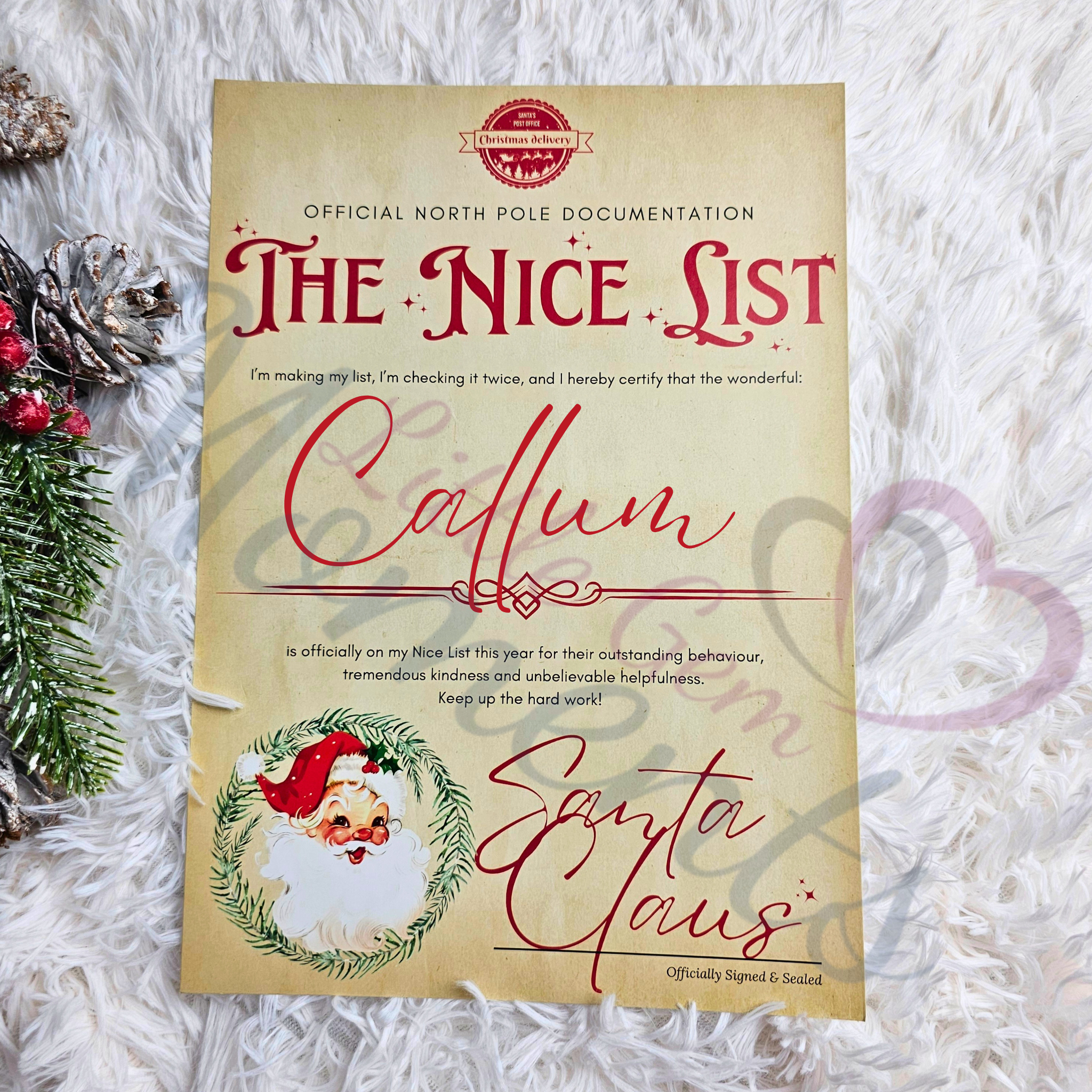This listing is for the Nice List Certificate with the rustic design and red writing - other colours and styles available on our shop!