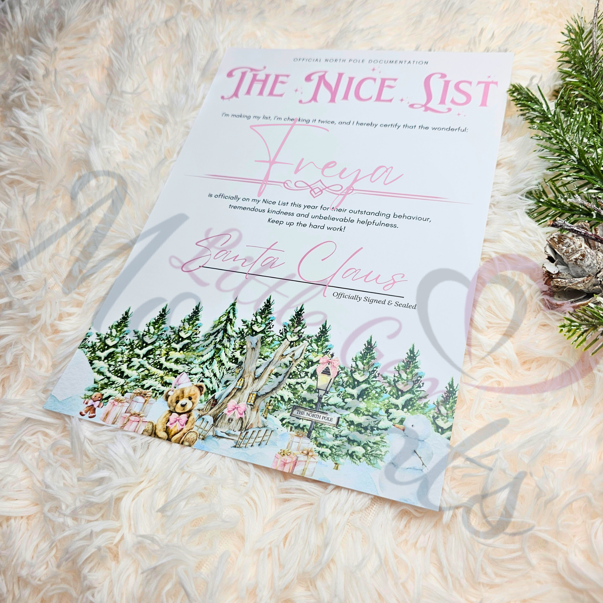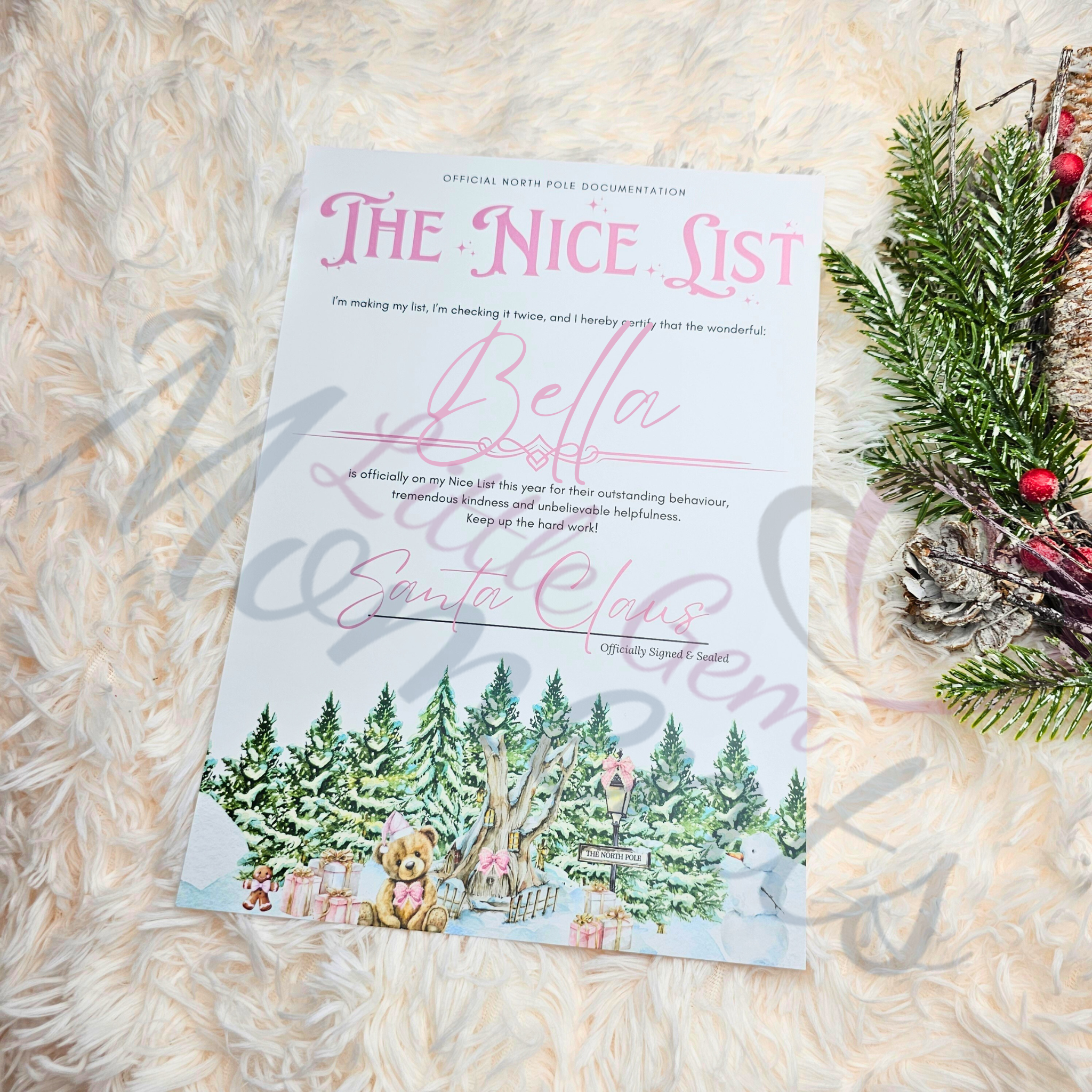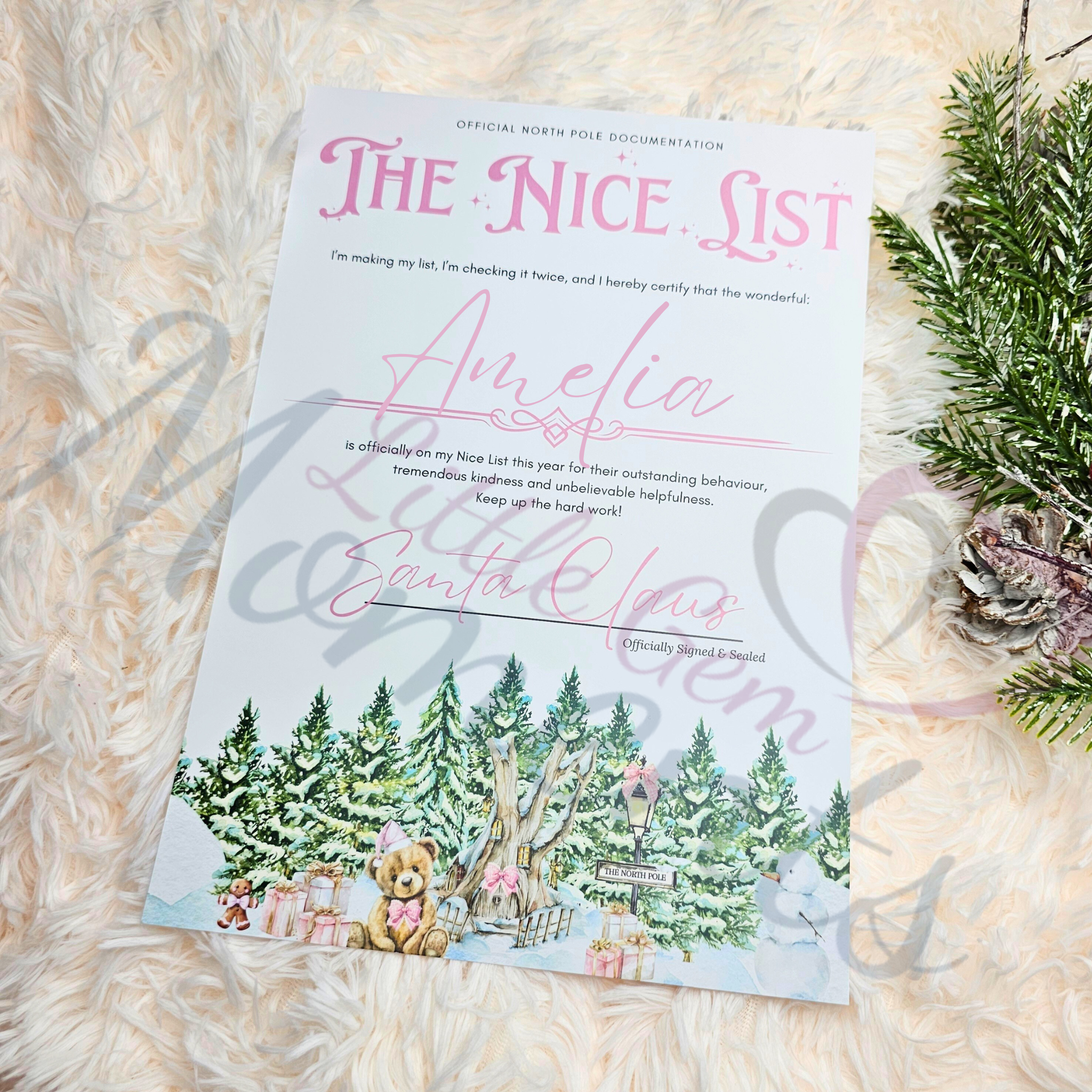Personalised Pink Nice List Certificate. Custom Christmas Eve Box Fillers