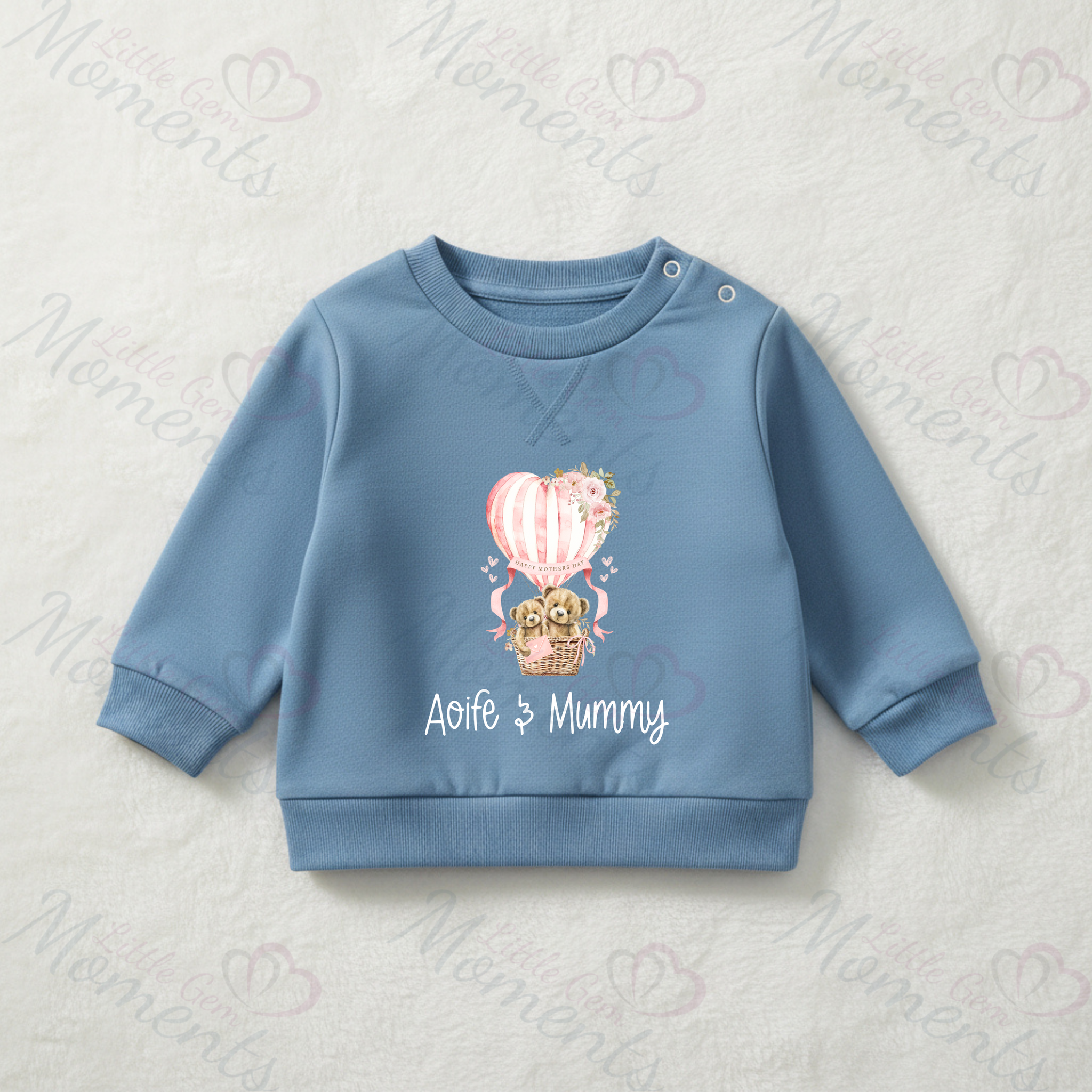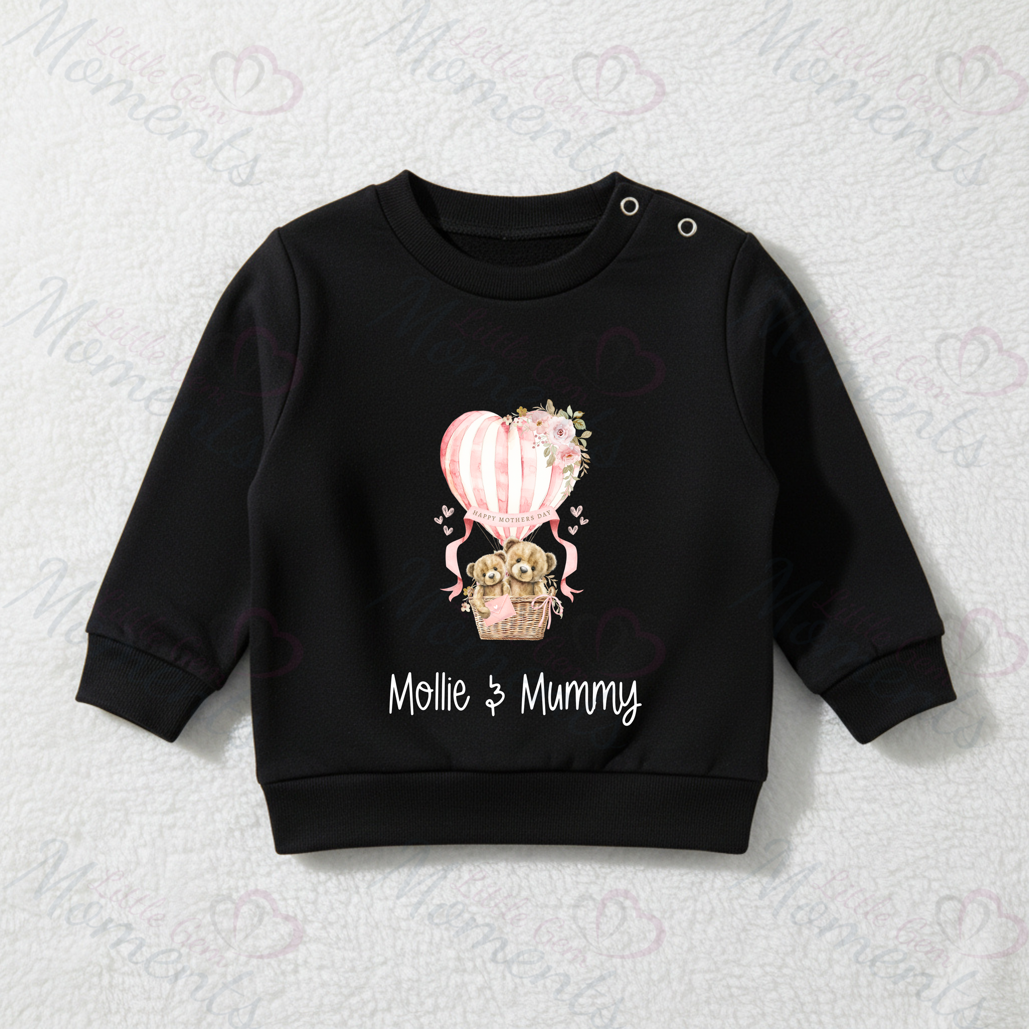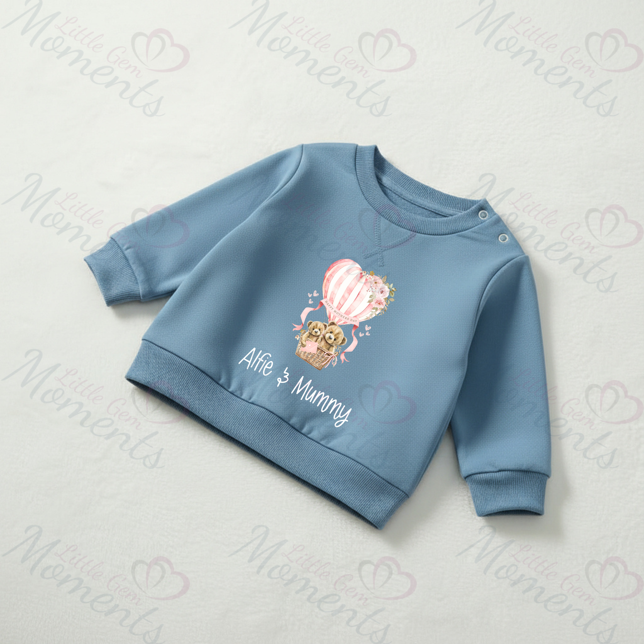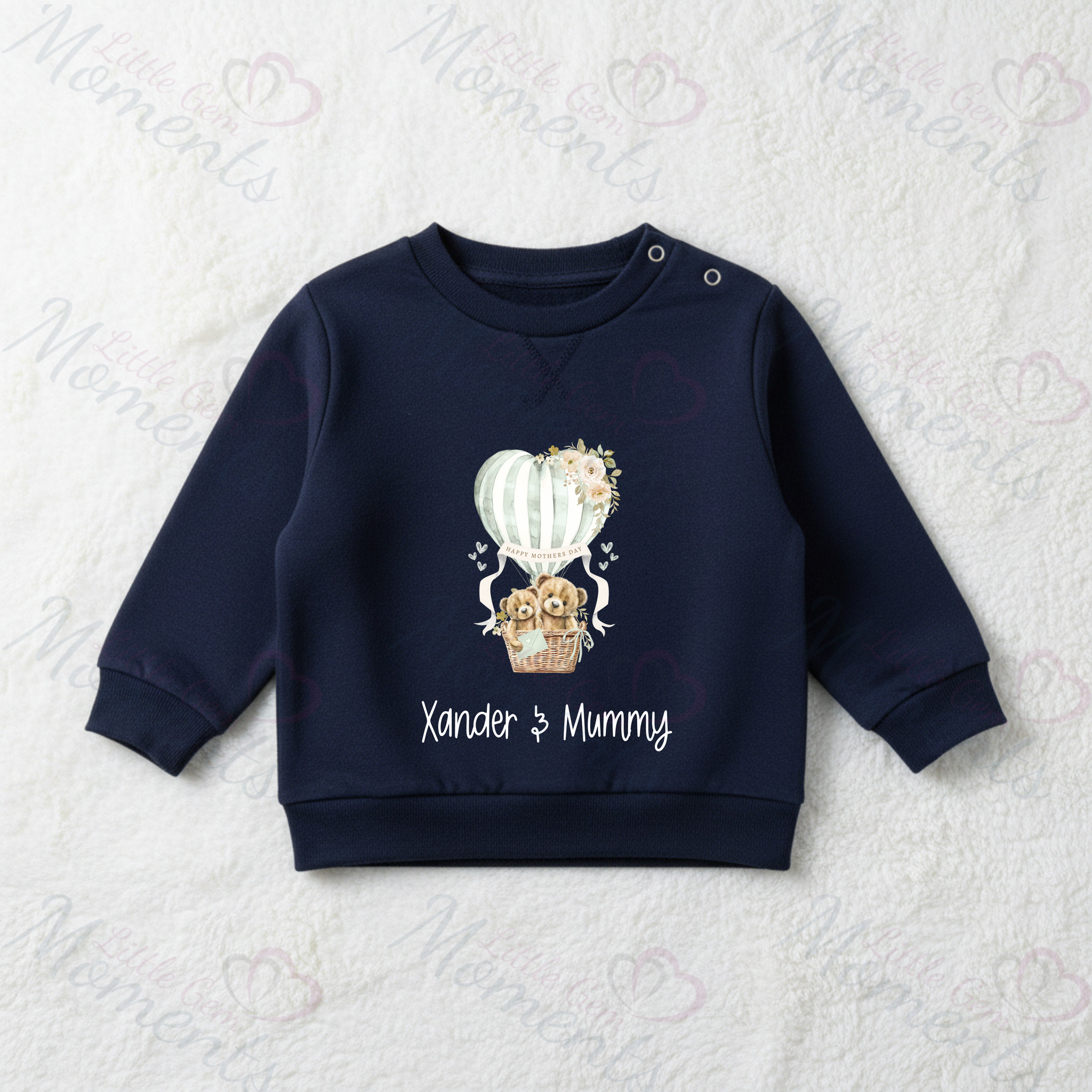 Personalised Happy Mother's Day Sweatshirt. Baby/Toddler Jumper - Teddy Hot Air Balloon Design