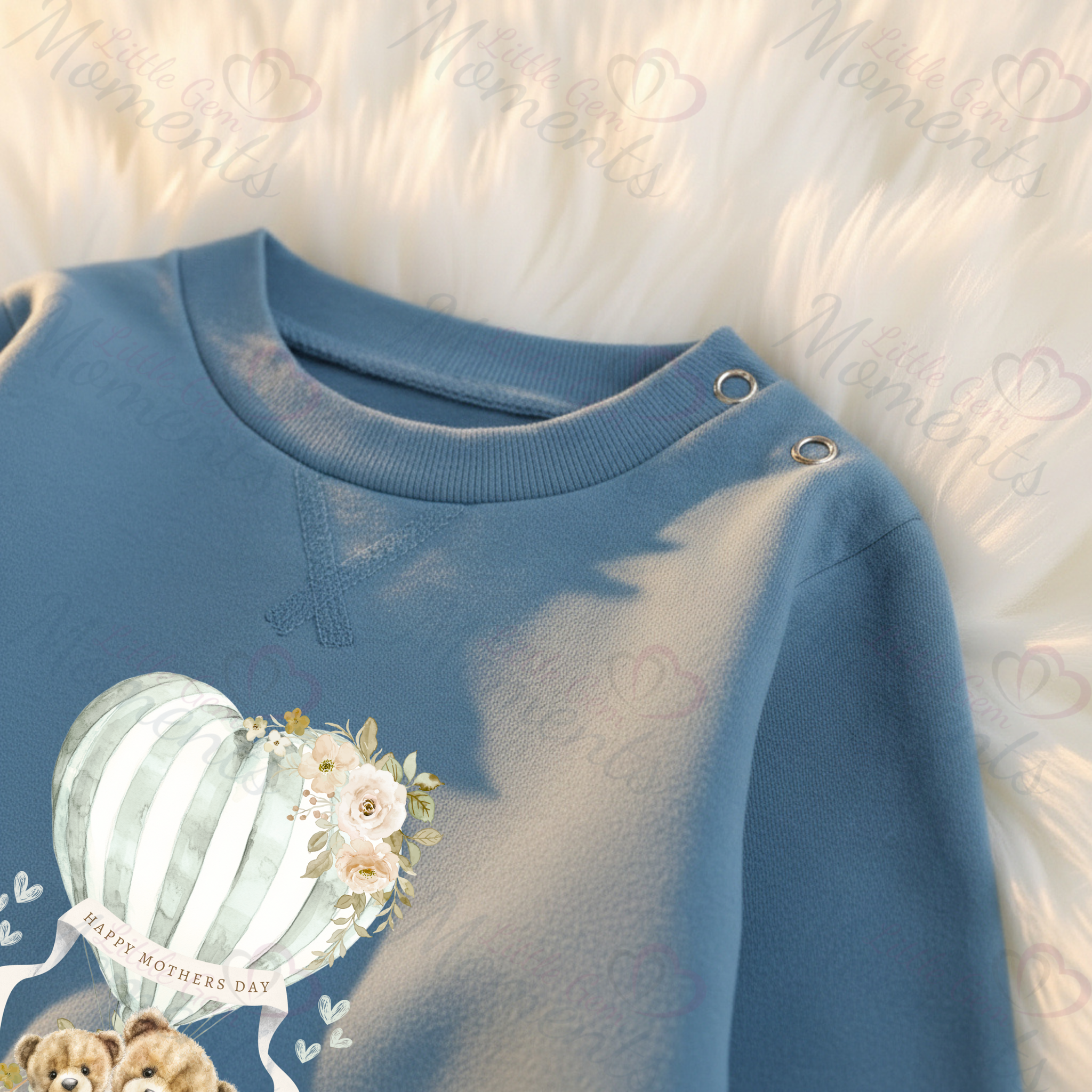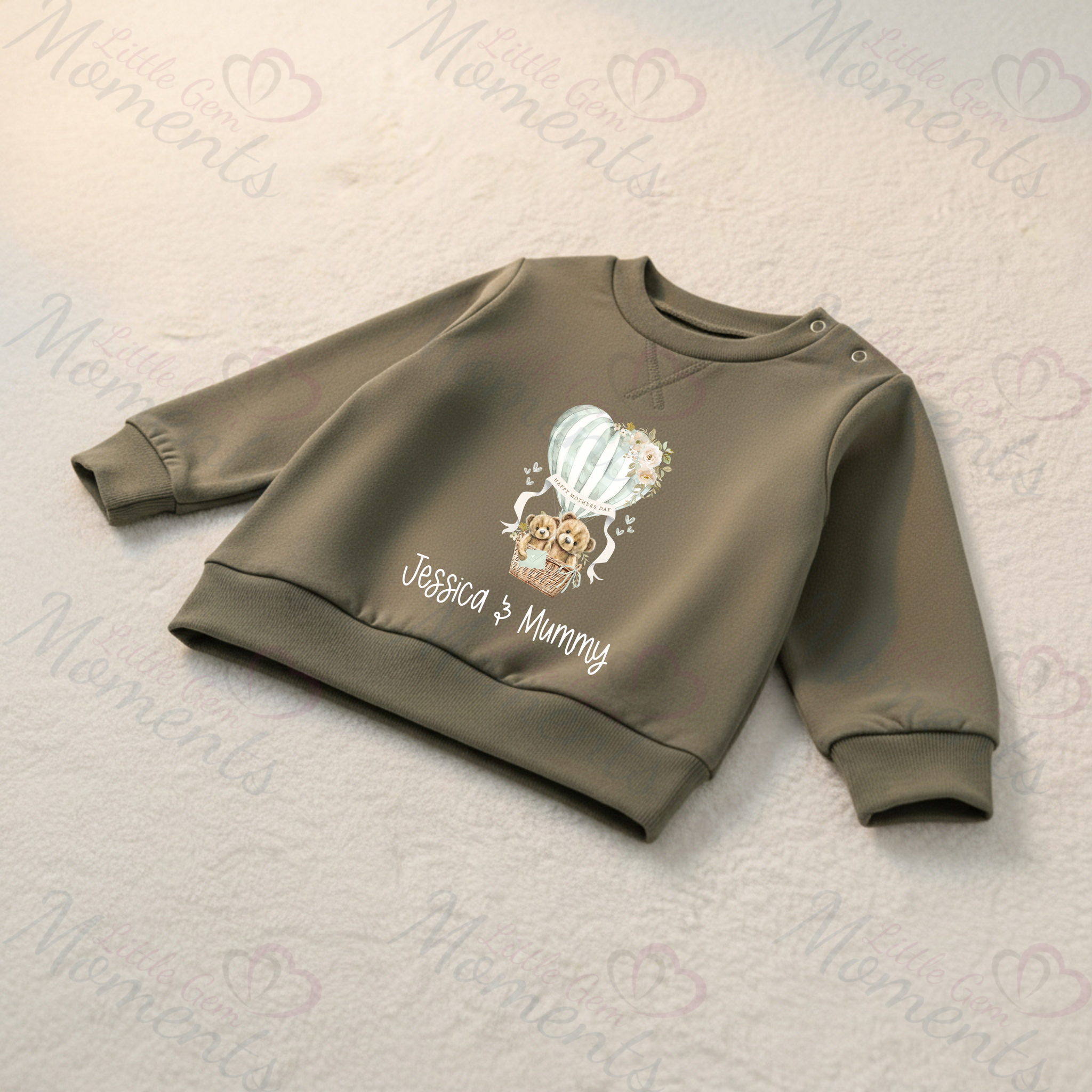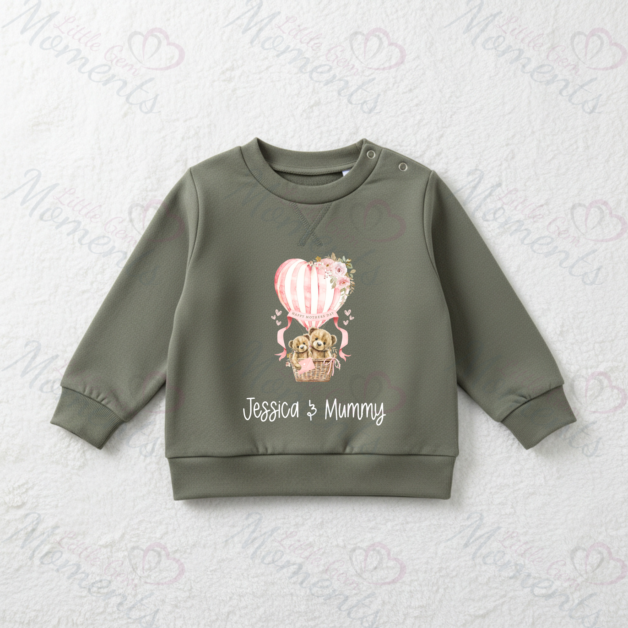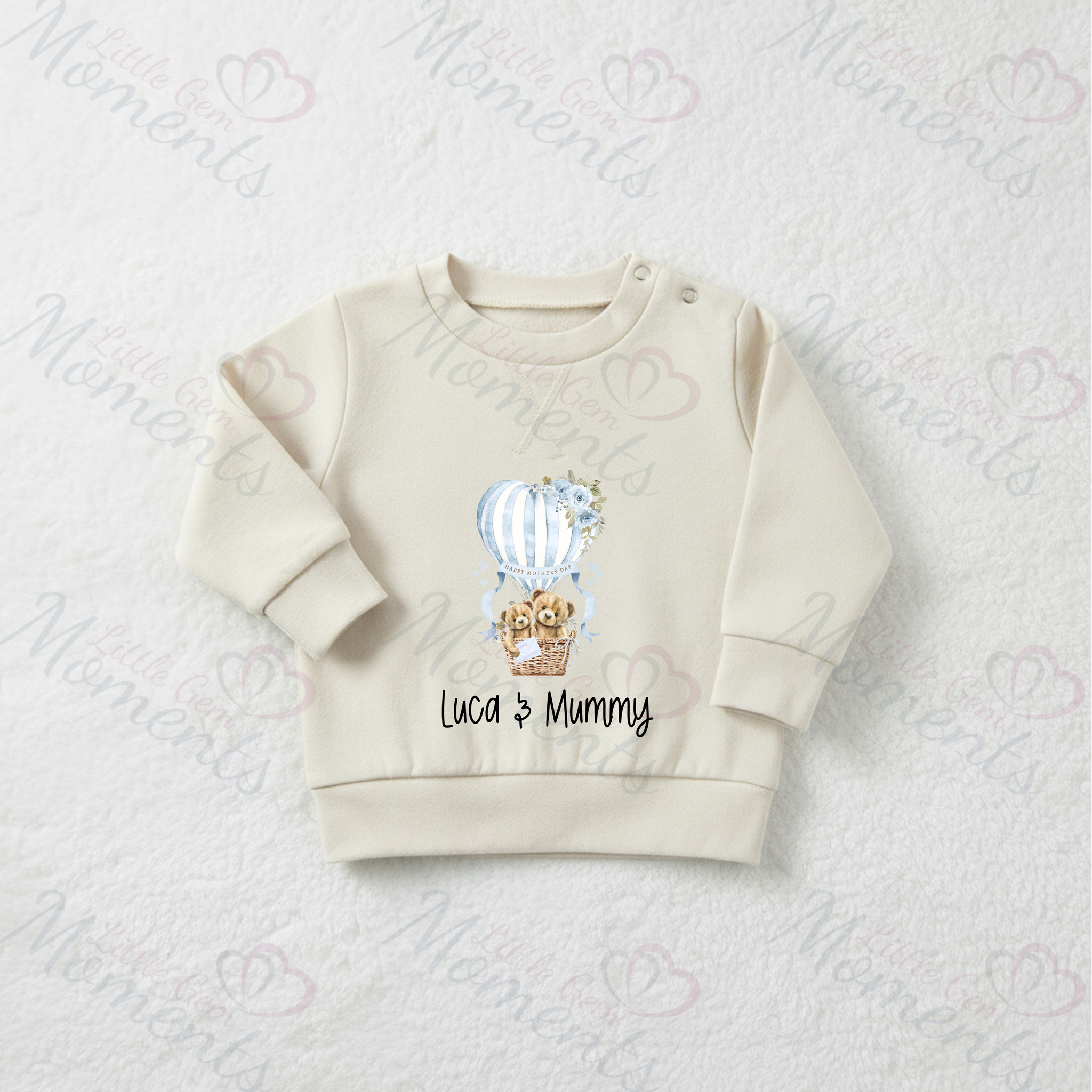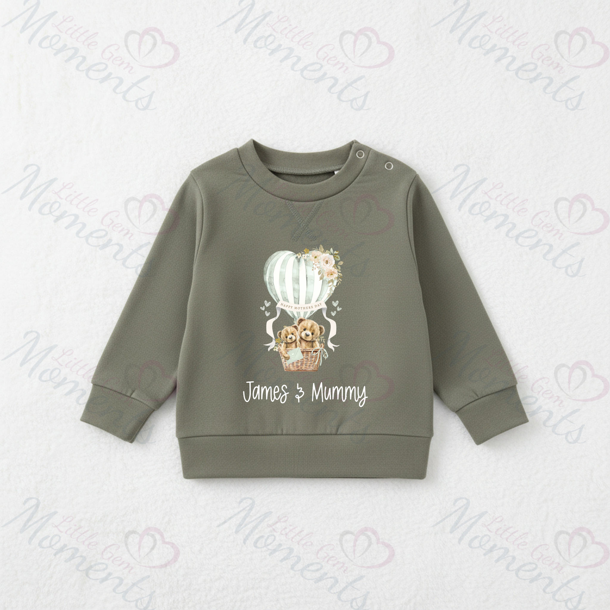 Personalised Happy Mother's Day Sweatshirt. Baby/Toddler Jumper - Teddy Hot Air Balloon Design