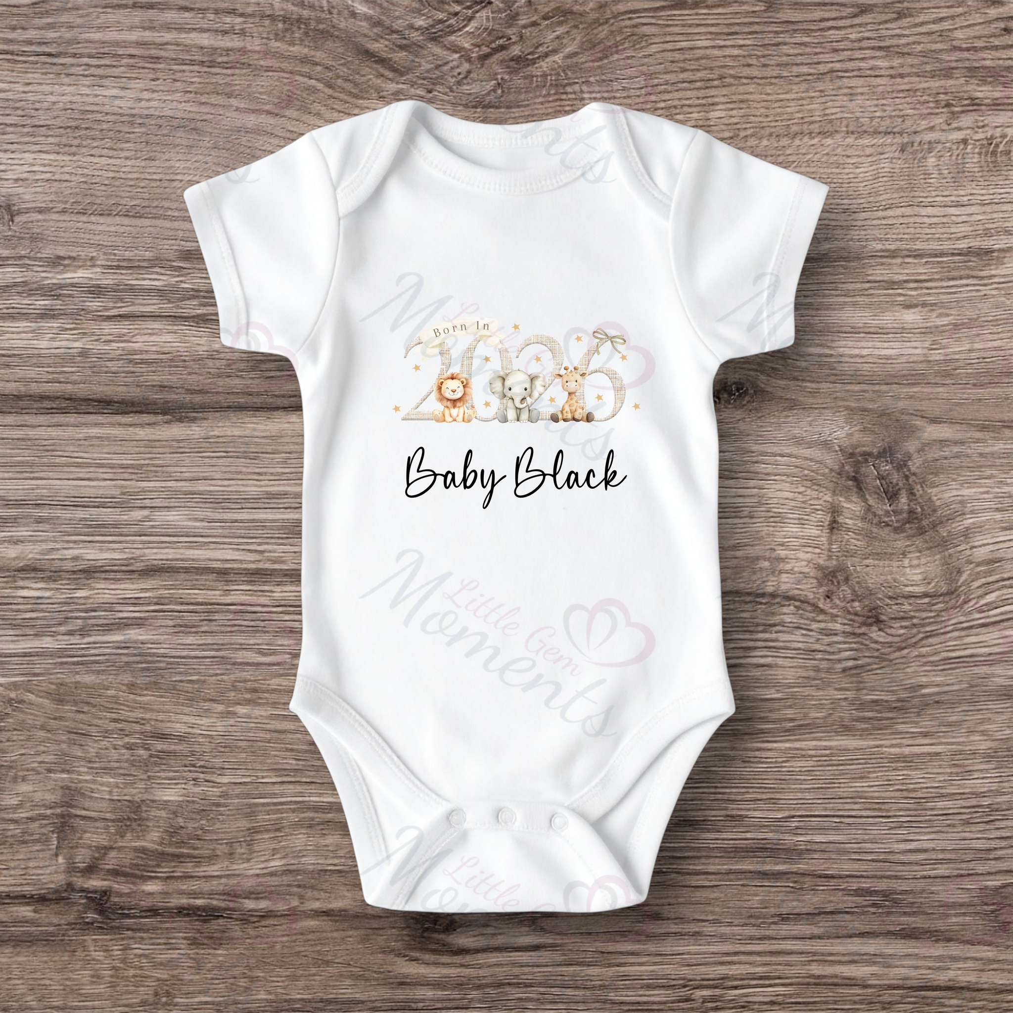 Personalised Born In 2026 Baby Bodysuit. Custom Baby Vest - Safari Animal Design