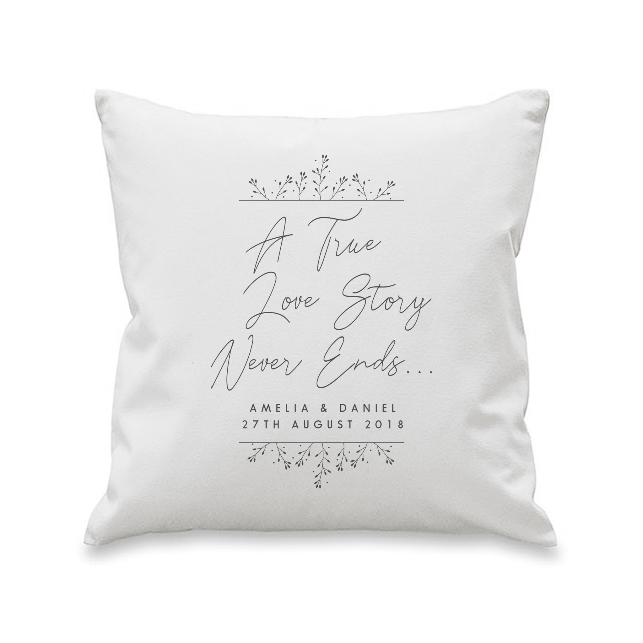 The beautiful phrase "A True Love Story Never Ends" stands proud in the centre of the cushion and your unique message is printed below.